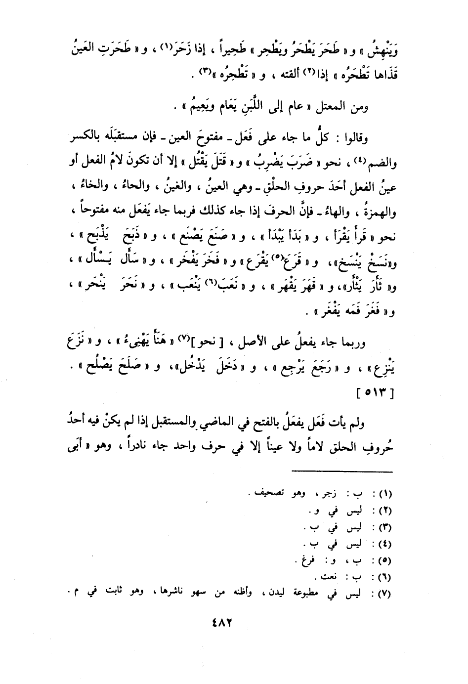 وقالوا: كل ما جاء على فَعَلَ - مفتوح العين - فإن مستقبله بالكسر والضم، نحو " ضَرَبَ يَضْرِبُ "، و " قَتَلَ يَقْتُل " إلا أن تكون لام الفعل أحد حروف الحلق - وهي العين، والغين، والحاء، والخاء، والهمزة، والهاء - فإن الحرف إذا جاء كذلك فربما جاء يفعل منه مفتوحاً، و " نَسَخَ يَنْسَخُ "، و " قَرَعَ يَقْرَعُ " و " فَخَرَ يَفْخَرُ "، و " سَأَلَ يَسْأَلُ "، " وَثَأَر يَثْأَرُ "، و " قَهَرَ يَقْهَرُ "، و " نَعَبَ يَنْعَبُ "، و " نَحَرَ يَنْحَرُ "، و " فَغَرَ فمه يَفْغَرُ ".