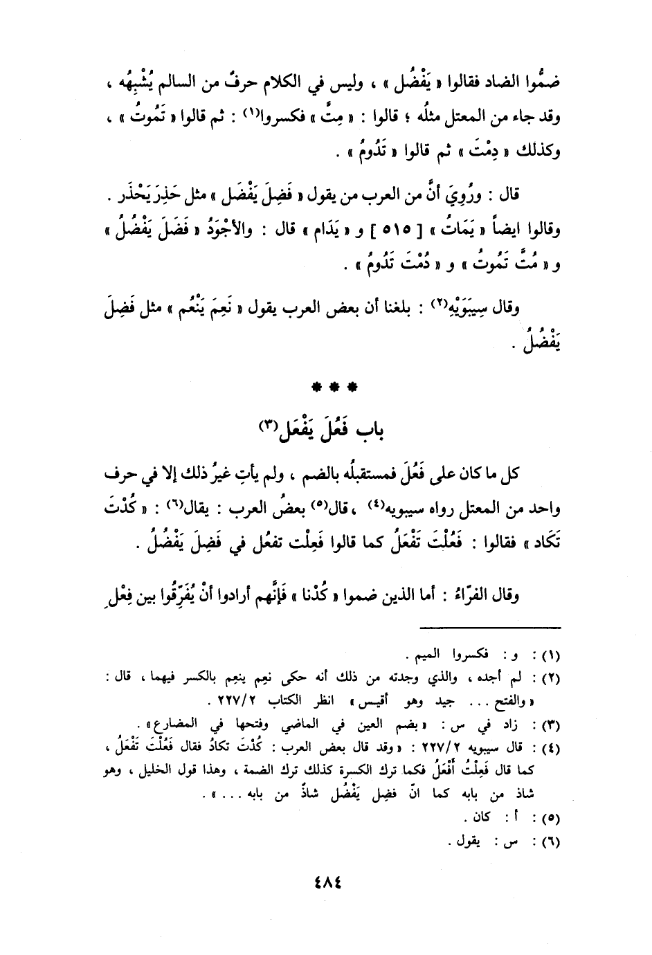 ضمُّوا الضاد فقالوا " يَفْضُلُ "، وليس في الكلام حرف من السالم يشبهه، وقد جاء من المعتل مثله؛ قالوا " مِتَّ " فكسروا: ثم قالوا " تَمُوت ". وكذلك " دِمْتُ " ثم قالوا " تَدُوم ".