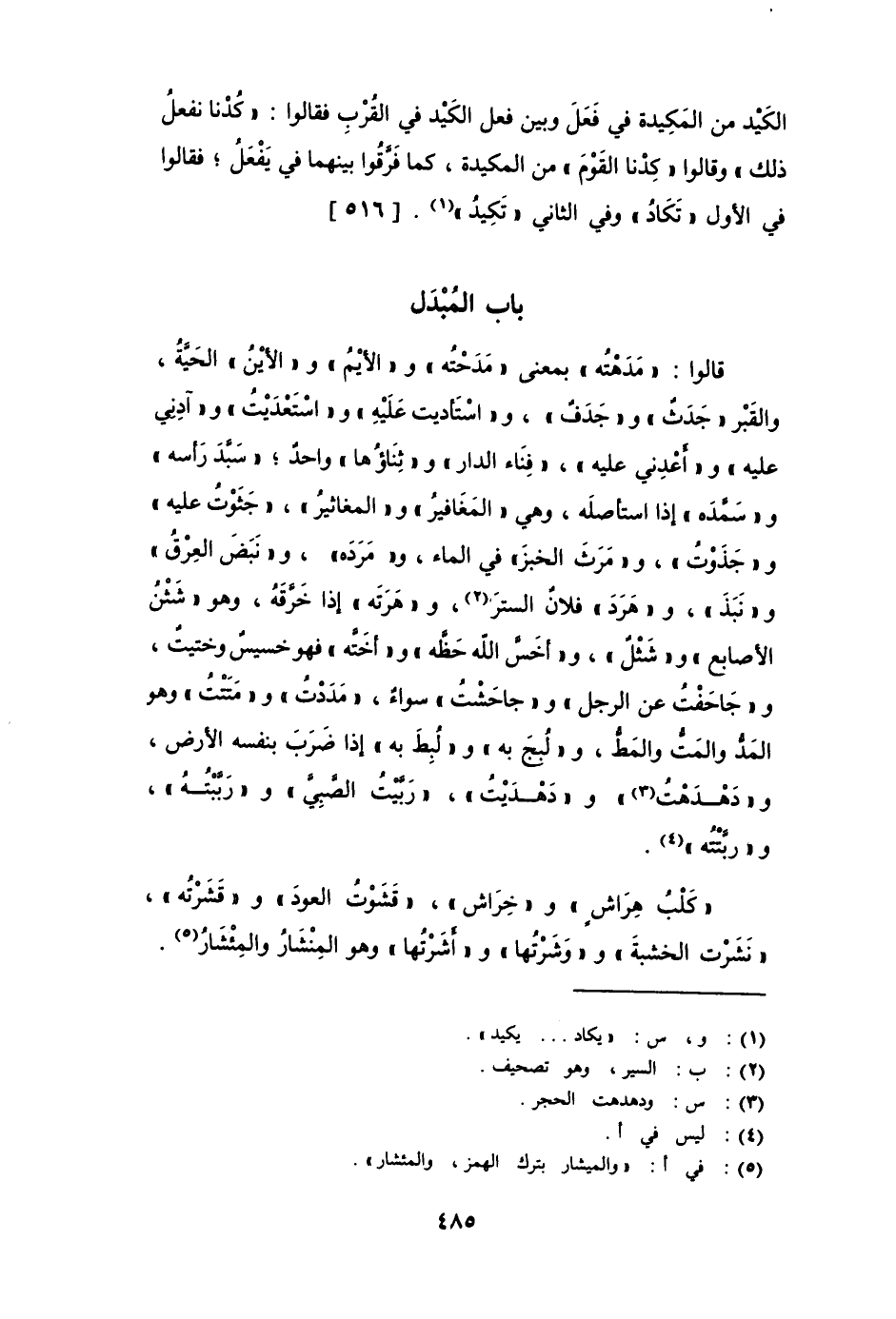 قالوا: " مَدَهتُه " بمعنى " مَدَحتُه "، و " الأيم " و " الأين " الحيَّة، والقبر " جَدَثٌ " و " جَدَفٌ "، و " اسْتَأديت عليه " و " اسْتَعديت " و " آدِني عليه " و " أعْدِني عليه "، " فِنَاء الدار " و " ثَنَاؤها " واحد؛ " سَبَّد رأسه " و " سَمَّدة " إذا استأصله، وهي " المَغَافير " و " المغاثير "، " جَثَوْت عليه " و " جَذَوْت "، و " مَرَثَ الخبز " في الماء، و " مَرَدَه "، و " نَبَضَ العِرق " و " نَبَذَ "، و " هَرَدَ " فلان الستر، و " هَرَتَه " إذا خرَّقه، وهو " شَثْنُ الأصابع " و " شَثْل "، و " أخسَّ الله حظَّه " و " أخَتَّه " فهو خسيس وختيت، و " جاحَفْت عن الرجل " و " جَاحَشت " سواء، و " مَدَدْت " و " مَتَتُّ " وهو المُّد والمتُّ والمطُّ، و " لُبجَ به " و " لُبط به " إذا ضَرَبَ بنفسه الأرض، " دَهْدهت الحجر " و " دَهْدَيت "، " رَبَّيت الصبي " و " رَبَّته "، و " رَبَّتُّه ".
