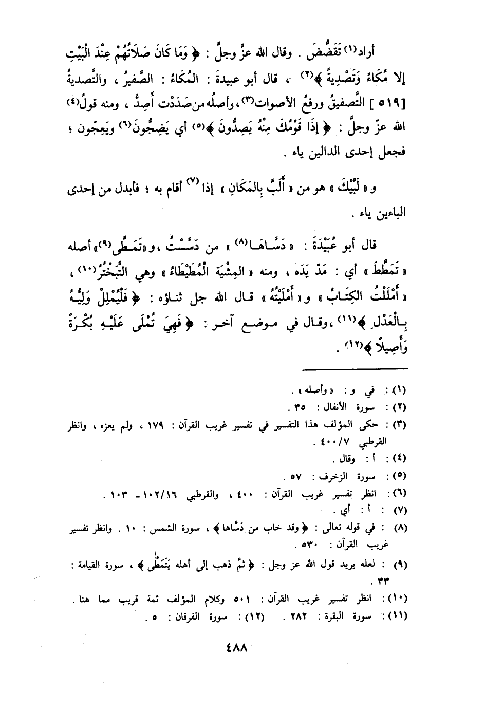 أراد تقضُّض وقال الله عزّ وجلّ:) وما كانَ صَلاتُهُم عندَ البيتِ إلا مُكَاءً وتَصْدِيَةً (قال أبو عبيدة: المكاء: الصفير، والتصدية التصفيق ورفع الأصوات، وأصله من صَدَدْت أصدُّ، ومنه قول الله عزّ وجلّ:) إذا قومُكَ منهُ يَصِدُّونَ (أي: يضِجُّون ويَعِجُّون؛ فجعل إحدى الدالين ياء.