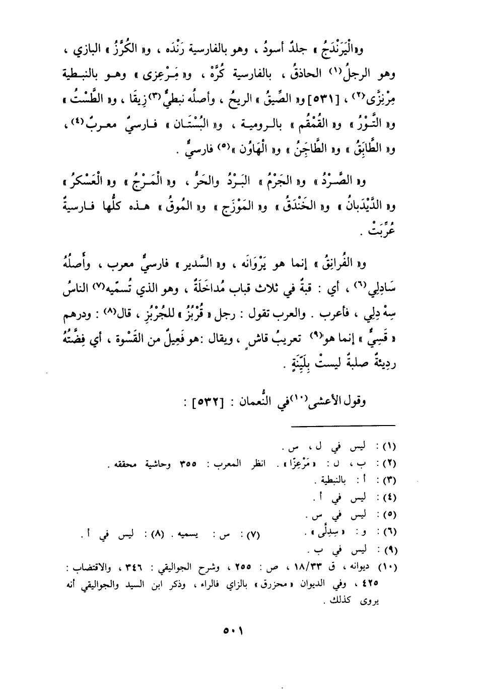 و" الفُرانق " إنما هو بَرْوانه، و " السَّدير " فارسي معرب، وأصله سَادِلي، أي: قبة في ثلاث قباب متداخلة، وهو الذي يسميه النَّاس سِهْ دِلي، فأعرب. والعرب تقول: رجل " قُرْبُز " للجُرْبُز "، قال: ودرهم " قَسِّيٌّ " إنما هو تعريب قاش، ويقال: هو فَعِّيلٌ من القَسْوة، أي: فضته رديئة صلبة ليست بلينة.