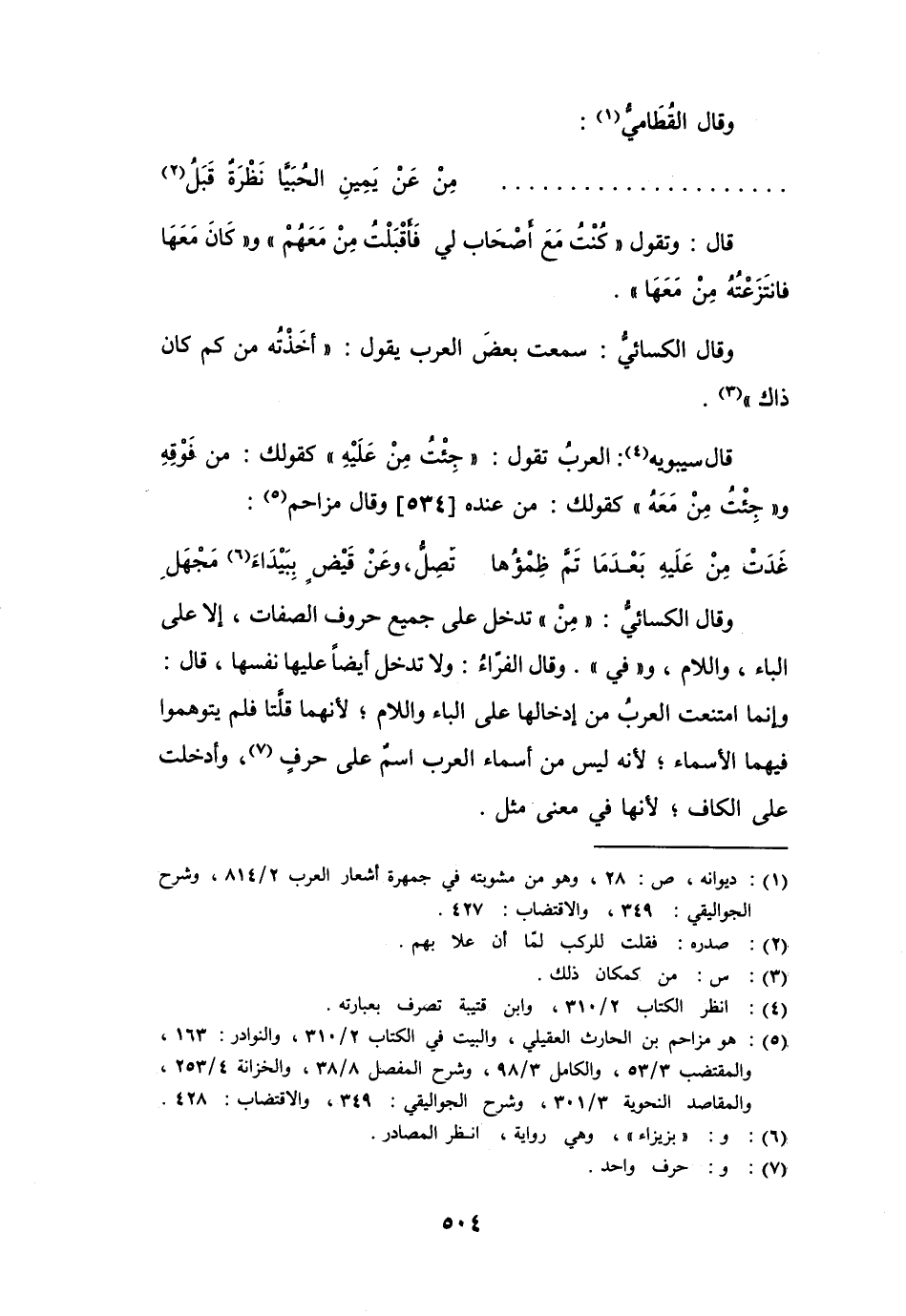 قال سيبوبه: العرب تقول: " جِئْتُ مِنْ عليه " كقولك: " من فَوْقِهِ "، و " جئتُ مِنْ مَعَهُ " كقولك: من عنده وقال مزاحم: