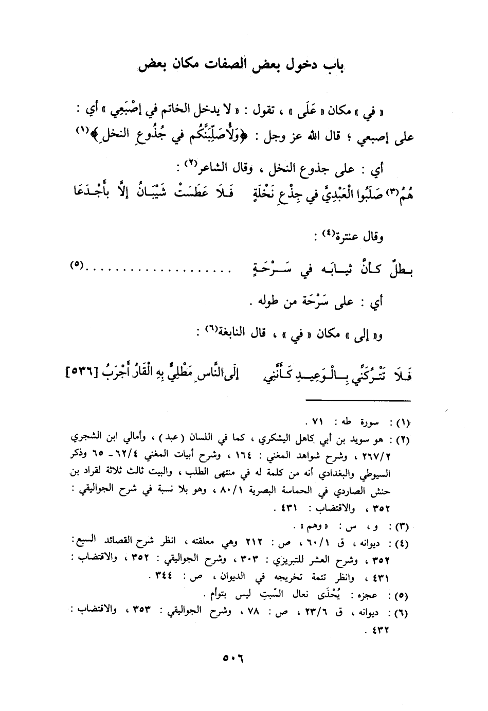 " في " مكان " على "، تقول: " لا يدخل الخاتم في إصبعي " أي: على إصبعي؛ قال الله عزّ وجلّ:) ولأصلِبَنَّكُم في جُذُوعِ النخلِ (أي: على جذوع النخل، وقال الشاعر: