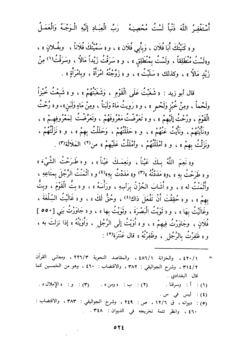 قال أبو زيد: " شَغَبْتُ على القوم، وشَغَبْتُهُمْ "، و " شَبِعْتُ خبزاً ولحماً، ومِنْ خبزٍ ولحمٍ "، و " رَوِيتُ ماءً ولبناً، ومِنْ ماءٍ ولبنٍ "، و " رُحْتُ القومَ، ورُحْتُ إليهم "، و " تَعَرَّضْتُ معروفَهُم، وتَعَرَّضْتُ لمعروفِهِم "، و " نَأَيْتُهَم، ونَأَيْتُ عنهم "، و " حَلَلْتُهَم، وحَلَلْتُ بهم "، وَنَزَلْتُهُم، ونَزَلْتُ بهم "، و " أَمْلَلْتُهُم، وأَمْلَلْتَ عليهم " من المَلاَلة.