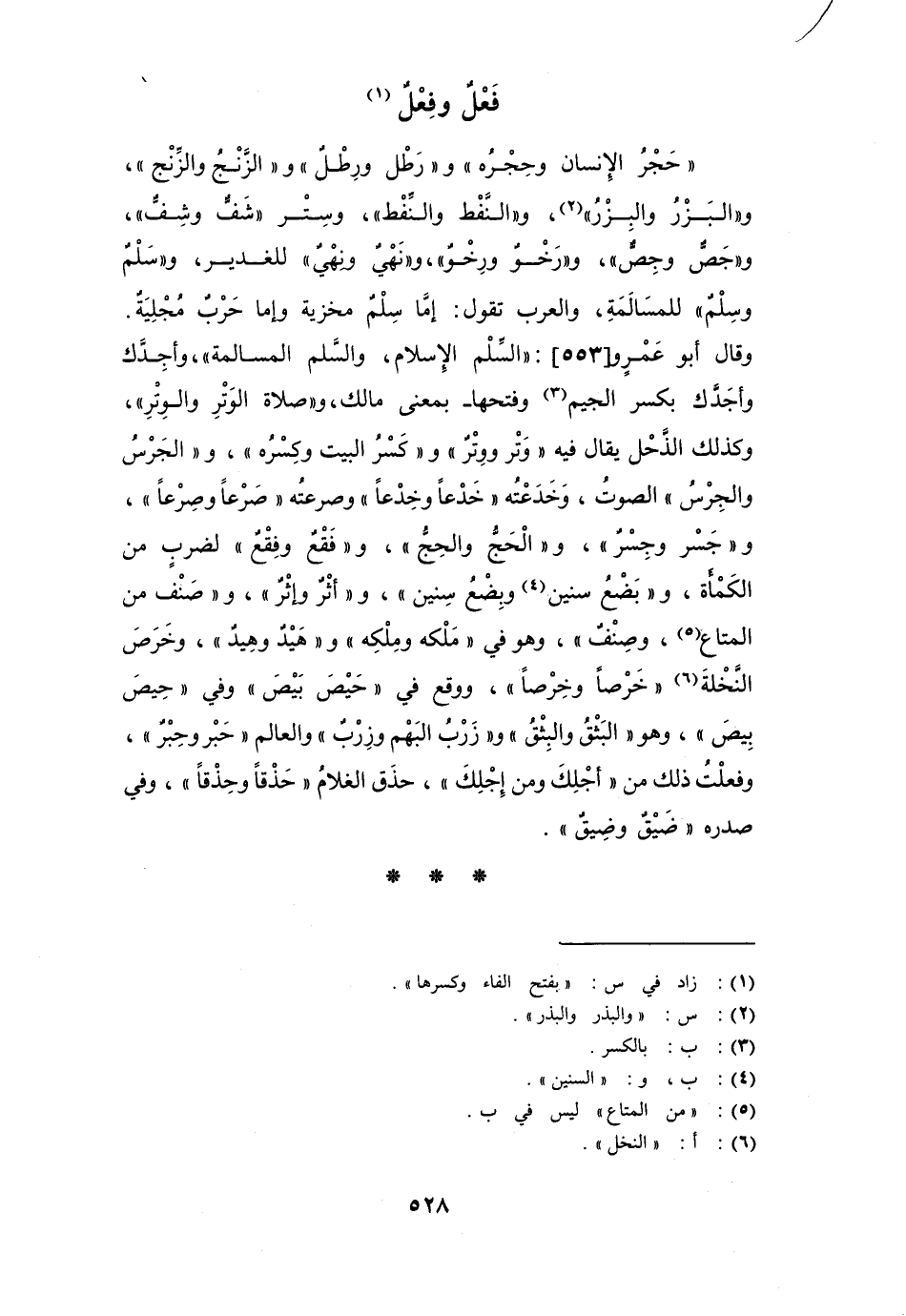 " حَجْرُ الإنسان وحِجْره " وَرَطْل ورِطْلٌ " و " الزَّنْجُ والزِّنْج "، و " البَذْرُ والبِذْرُ "، و " النَّفْط والنِّفْط "، وستِرْ " شَفٌّ وشِفٌّ "، و " جَصٌّ وجِصٌّ "، و " رَخْوٌ ورِخْوٌ "، و " نَهْيٌ ونِهْيٌ " للغدير، و " سَلْم وسِلْم " للمسالمة، والعرب تقول: إمَّا سِلْم مخزية وإما حرب مُجْلية. وقال أبو عمرو السِّلْم الإسلام، والسَّلم المسالمة، أجِدَّك وأجَدَّك - بكسر الجيم وفتحها - بمعنى مالك، و " صلاة الوَتْر والوِتْر "، وكذلك الذَّحْل يقال فيه " وَتْر ووِتْرٌ " و " كَسْر البيت وكِسْره "، و " الجَرْس الجِرْس " الصوت، و " خدعته خَدْعاً وخِدْعاً " وصرعته " صَرْعاً وصِرْعاً "، و " جَسْر وجِسْر "، و " الحَجُّ والحِجُّ "، و " فَقْعٌ وفِقْعٌ " لضرب من الكَمْأة، و " بَضْع سنين وبِضْع سنين "، و " أَثْرٌ وإِثْر "، و " صَنْف من المتاع، وصِنْفٌ "، وهو في " مَلْكه ومِلْكه " و " هَيْد وهِيدٌ "، وخَرَصَ النخلة " خَرْصاً وخِرْصاً "، ووقع في " حَيْصَ بَيْصَ " وفي " حِيصَ بِيصَ "، وهو " البَثْق والبِثْق "، و " زَرْب البَهْم وزِرْب البهم " والعالم " حَبْر وحِبْرٌ "، فعلْت ذلك من " أَجْلك ومن إِجْلك " حذ " ق الغلام " حَذْقاً وحِذْقاً " وفي صدره " ضَيْقٌ وضِيقٌ ".