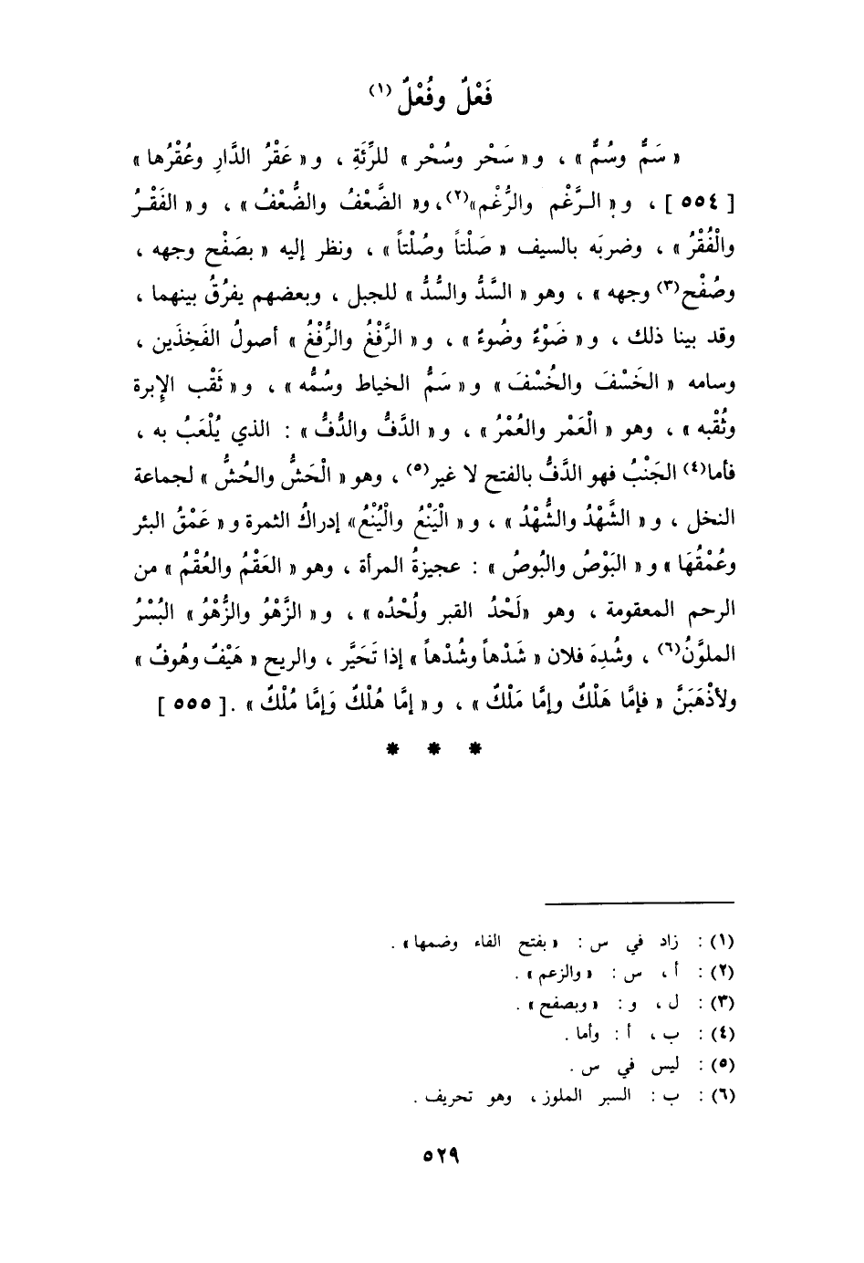 " سَمّ وسُمّ "، و " سَحْر وسُحْر " للرِّئة، و " عَقْر الدار وعُقْرها "، و " الرَّغْم والرُّغْم "، و " الضَّعْف والضُّعْف "، و " الفَقْر والفُقْر "، وضربه بالسيف " صَلْتاً وصُلْتاً "، ونظر إليه " بصَفْح وجهه، وصُفْح وجهه "، وهو " السَّدُّ والسُّدُّ " للجبل، وبعضهم يفرق بينهما، وقد بينا ذلك، و " ضَوْء وضُوءٌ "، و " الرَّفْغُ والرُّفْغُ " أصول الفخذين، وسامه " الخَسْف والخُسْف " و " سَمُّ الخياط وسُمُّه "، و " ثَقْب الإبرة وثُقْبه "، وهو " العَمْر والعُمْر "، و " الدَّفُّ والدُّفُّ " الذي يلعب به، فأما الجنب فهو الدَّفُّ بالفتح لا غير، وهو " الحَشُّ والحُشُّ " لجماعة النخل، و " الشَّهْد والشُّهْد "، و " اليَنْع واليُنْع " إدراك الثمرة و " عَمْق البئر وعُمْقها " و " البَوْص والبُوص " عجيزة المرأة، وهو " العَقْم والعُقْم " من الرحم المعقومة، وهو " لَحْد القبر ولُحْده "، و " الزَّهْو والزُّهْوُ " البسر الملون، وشُدِهَ فلان " شَدْهاً وشُدْهاً " إذا تَحَيَّر، والريح " هَيْفٌ وهُوفٌ " ولأذْهَبَنَّ فإمَّا " هَلْكٌ وإما مَلْكٌ "، و " إمَّا هُلْكٌ وإمَّا مُلْكٌ ".