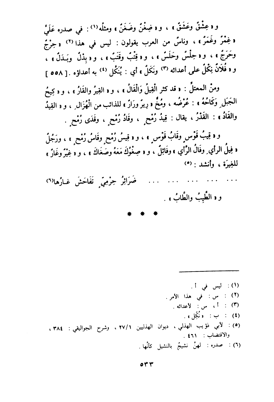 و " عِشْقٌ وعَشَقٌ "، و " ضِغْنٌ وضَغَنٌ " ومثله: في صدره عليَّ " غِمْرٌ وغَمَرٌ "، وناس من العرب يقولون: ليس في هذا الأمر " حِرْجٌ وحَرَجٌ "، و " حِلْسٌ وحَلَسٌ "، و " قِتْبٌ وقَتَبٌ "، و " بِدْلٌ وبَدَلٌ "، و " فلانٌ نِكْلٌ لأعدائه ونَكَلٌ " أي: يُنَكِّل به أعداؤه.