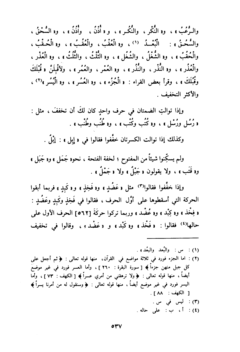 والرُّعُب "، و " النُّكْر، والنُّكُر "، و " أُذْنٌ، وأُذُنٌ "، و " السُّحْق، والسُّحُق "، و " البُعْدُ، والبُعُد "، و " العُقْبُ، والعُقُب "، و " الحُقْبُ، والحُقُبُ "، و " الشُّغْل، والشُّغُل "، و " الثُّلْث، والثُّلُث "، و " العُذْر، والعُذُر "، و " النُّذْر والنُّذُر "، و " العُمْر والعُمُر "، ولأقبلنَّ قُبْلَكَ وقُبُلَكَ "، وقرأ بعض القراء: " الجُزُء "، و " العُسُر "، واليُسُر "، والأكثر التخفيف.