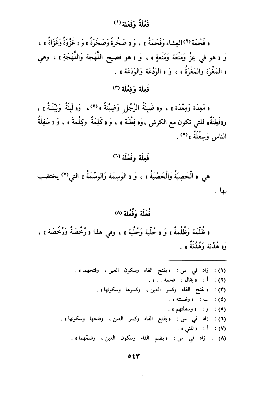 " مَعِدَة وَمِعْدَة "، " ضَبِنَة الرَّجُلِ وضِبْنَةٌ "، وَ " لَبِنَةٌ وَلِبْنَةٌ "، وَ " قَطِنَةٌ " للتي تكون مع الكرش، و " قِطْنَة "، و " كَلِمَةٌ وَكِلْمَة "، و " سَفِلَةُ الناس وسِفْلَةُ ".