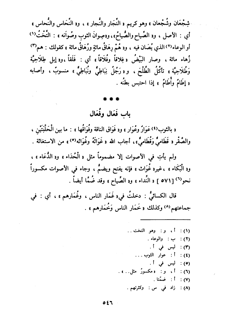شُجْعَان وشِجْعَان " وهو كريم " النِّجَار والنُّجَار "، و " النِّحاس والنُّحاس " أي: الأصل، و " الصِّياح والصُّياح " و " صِوَان الثوب وصُوَانه ": التَّخْتُ أو الوعاء الذي يُصان فيه، و " هُمْ رِهَاقُ مائةٍ ورُهاقُ مائة " كقولك: هم زُهاء مائة، وصار البَيْض " فِلاقاً وفُلاقاً " أي: فَلَقاً، و " إبل طِلاحيَّة وطُلاحِيَّة " تأكُلُ الطَّلْحَ، و " رجلٌ نِبَاطيّ ونُبَاطيٌّ " منسوب وأصابه " إطَامٌ وأُطامٌ " إذا احتبس بطنه.
