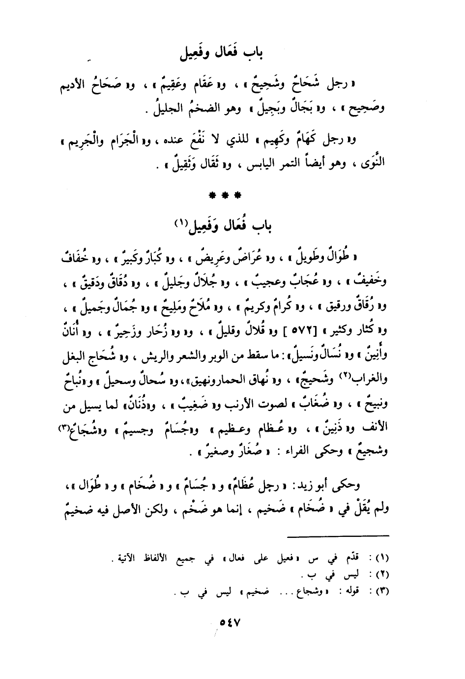 " رجل شَحَاحٌ وشَحِيح "، و " عَقَام وعَقِيم "، و " صَحَاح الأديم وصَحِيح "، و " بَجَالٌ وبَجِيل " وهو الضخم الجليل.