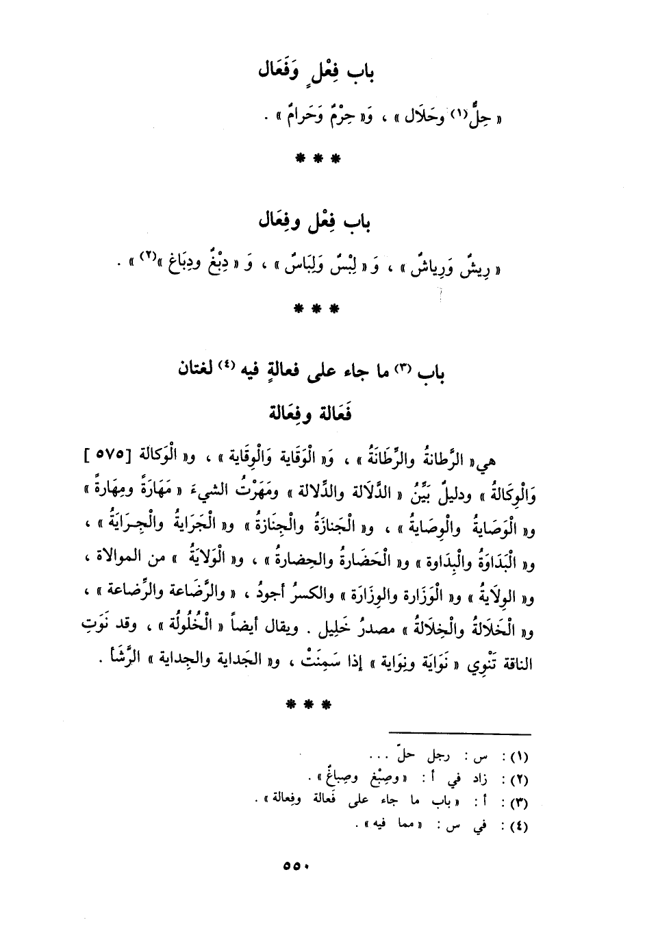 هي " الرَّطَانة والرِّطَانة "، و " الوَقَاية والوِقَاية "، و " الوَكَالة والوِكالة "، ودليلٌ بيِّن " الدَّلالة والدِّلالة "، ومَهَرْتُ الشيء " مَهَارةً ومِهَارة "، و " الوَصَاية والوِصَاية "، و " الجَنَازة والجِنَازة "، و " الجَرَاية والجِرَاية "، و " البَدَاوة والبِدَاوة "، و " الحَضَارة والحِضَارة "، و " الوَلايَة " من الموالاة، و " الوِلاية "، و " الوَزَارة والوِزَارة " والكسر أجود، و " الرَّضَاعة والرِّضَاعة "، و " الخَلالة والخِلالة " مصدر خَليل. ويقال أيضاً " الخُلُولة ". وقد نَوَت الناقة تَنْوي " نَوَاية " ونِوَاية " إذا سَمِنَتْ، و " الجَدَاية والجِداية " الرَّشَأ.