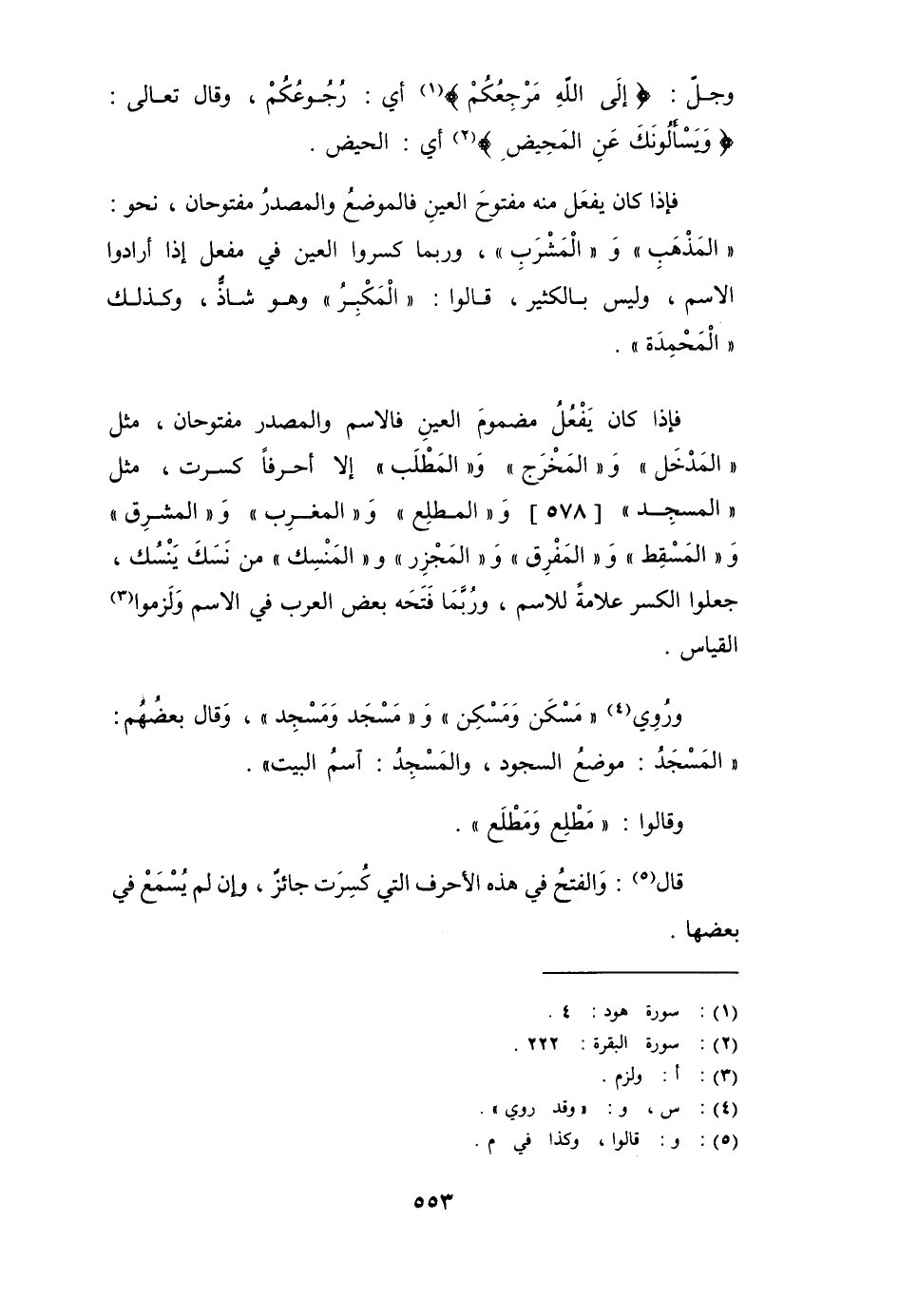 ) إلى الله مَرْجِعُكم (أي: رُجُوعكم، وقال عزّ وجلّ:) ويَسْألونَكَ عن المَحِيض (أي: الحيض.