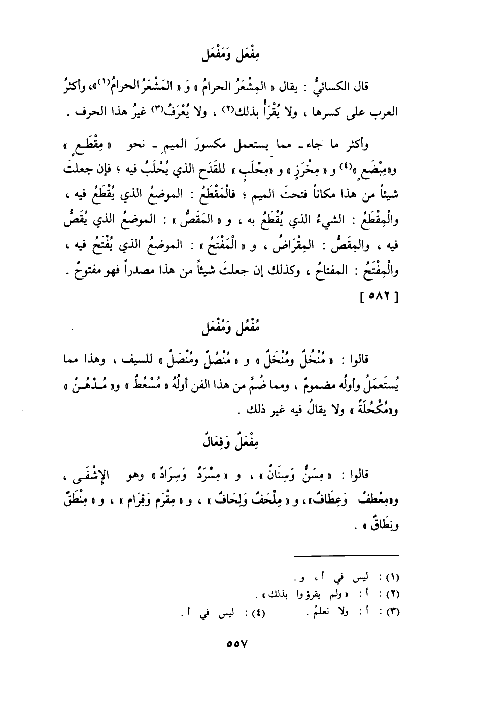وأكثر ما جاء - مما يستعمل مكسور الميم - نحو " مِقْطَع " و " مِبْضَع " و " مِخْرَز " و " مِحْلَب " للقَدَح الذي يُحْلَب فيه؛ فإن جعلت شيئاً من هذا مكاناً فتحت الميم؛ فالمَقْطَع: الموضع الذي يقطع فيه، والمِقْطَع: الشيء الذي يقطع به، و " المَقَصُّ ": الموضع الذي يُقَصُّ فيه، والمِقَصُّ: المِقْرَاض، و " المَفْتَح ": الموضع الذي يفتح فيه، والمِفْتَح: المفتاح، وكذلك إن جعلت شيئاً من هذا مصدراً فهو مفتوح.