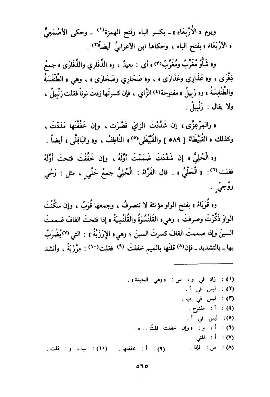 و" شَأْوٌ مُغَرِّبٌ ومُغَرَّب " أي: بعيد، و " الذَّفارَي والذَّفارَى " جمع ذِفْرى، و " عَذَارَى وعَذَارِي "، و " صَحَارَى وصَحَاري "، وهي " الطَّنْفَسَة والطِّنْفِسَة "، و " زَبِيل " مفوحة الزاي، فإن كسرتها زدت نوناً فقلت " زِنْبيل "، ولا يقال: ز " نْبيل.