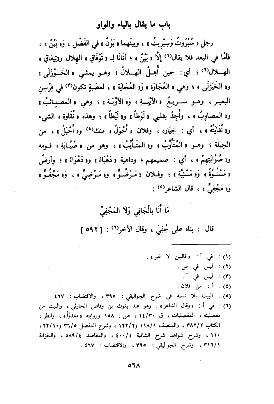 رجل " سُبْرُوتٌ وسِبْرِيت "، وبينهما " بَوْنٌ " في الفَضْل، و " بَيْنٌ "، فأما في البعد فلا يقال إلا " بَيْنٌ "؛ أتانا لِتَوْفاق الهلال وتِيقاق، أي: حين أُهِلَّ الهلال؛ وهو يمشي الخَوْزَلى والخَيْزَلى؛ وهي العُجَاوَة والعُجَايَة، لعصبة تكون في فِرْسِن البعير؛ وهو سريع الأبْيَةِ والأوْبَة؛ وهي المصائِبُ والمصاوِب؛ أجد بقلبي لَوْطاً ولَيْطاً؛ وهذه نُقَاوَة الشيء ونُقَايَتُه، أي: خِيَاره؛ وفلان أَحْوَل منك وأَحْيَل، من الحيلَة؛ وهو المُتَأَوِّبُ والمتَأَيِّبُ؛ وهو من صُيَّابة قومه وصُوَّابتهم، أي: صميمهم؛ وداهية دَهْيَاءُ ودَهْوَاء؛ وأرض مَسْنَوّة ومَسْنِيَّة؛ وفلان مَرْضَوٌّ ومَرْضِيٌّ، ومَجْفُوٌّ ومَجْفِيٌّ، قال الشاعر: