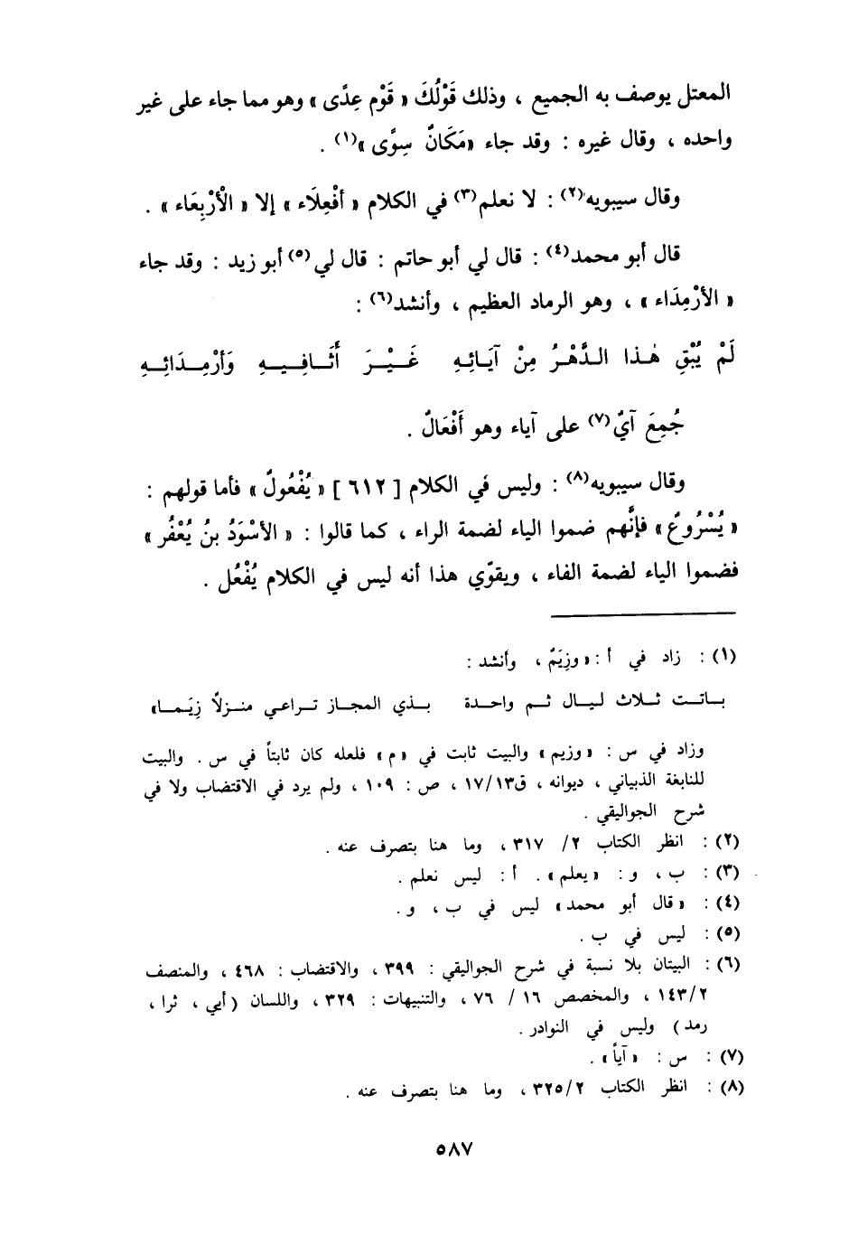 المعتل يوصف به الجميع، وذلك قولك " قَوْم عِدًى " وهو مما جاء على غير واحدة، وقال غيره: وقد جاء " مَكَانٌ سِوًى "، و " زِيَمٌ "، وأنشد: