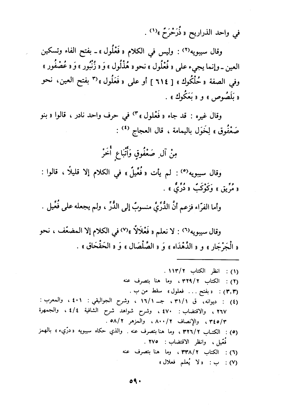 وقال سيبويه: وليس في الكلام " فَعْلُول " - بفتح الفاء وتسكين العين - وإنما يجيء على " فُعْلُول " نحو " هُذْلُول " و " زُنْبُور " و " عُصْفُور " وفي الصفة " حُلْكُوك " أو على " فَعَلول " - بفتح العين - نحو " بَلَصُوص " و " بَعَكُوك ".