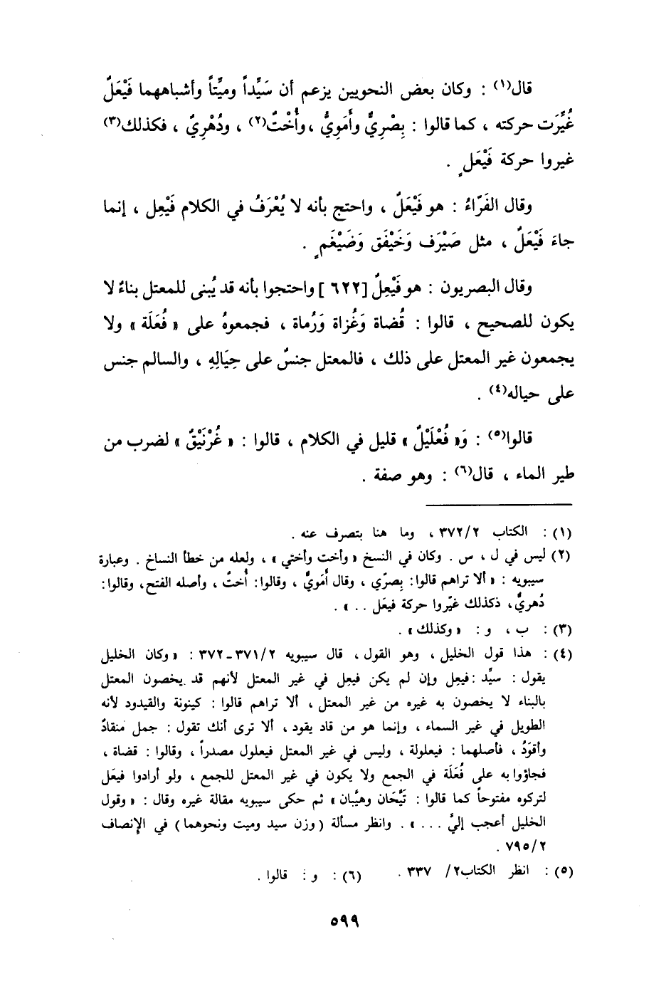 وقال بصريون: هو فَيْعِلٌ واحتجوا بأنه قد يُبنى للمعتل بناءٌ لا يكون للصحيح، قالوا: قُضَاة وغُزَاة ورُمَاة، فجمعوه على فُعَلَة، ولا يجمعون غير المعتل على ذلك؛ فالمعتل جنسٌ على حِياله، والسالم جنس على حياله.