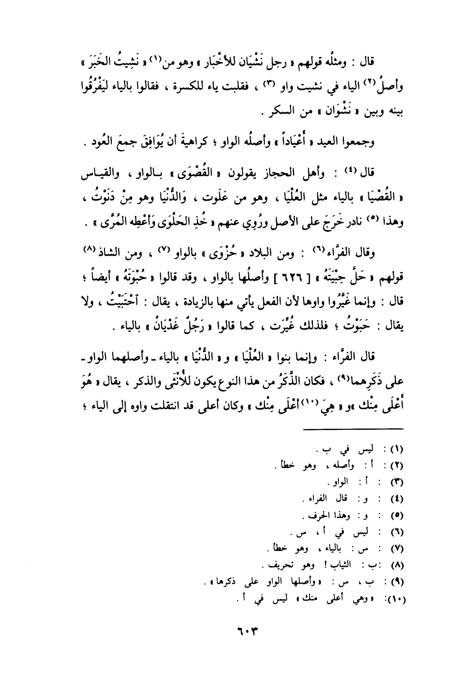 قال: ومثله قولهم " رجل نَشْيَان للأخَبْار " وهو من " نَشِيتُ الخبَرَ " وأصل الياء في نشيت واو، فقلبت ياء للكسرة، فقالوا بالياء ليفرقوا بينه وبين " نَشْوَان " من السكر.