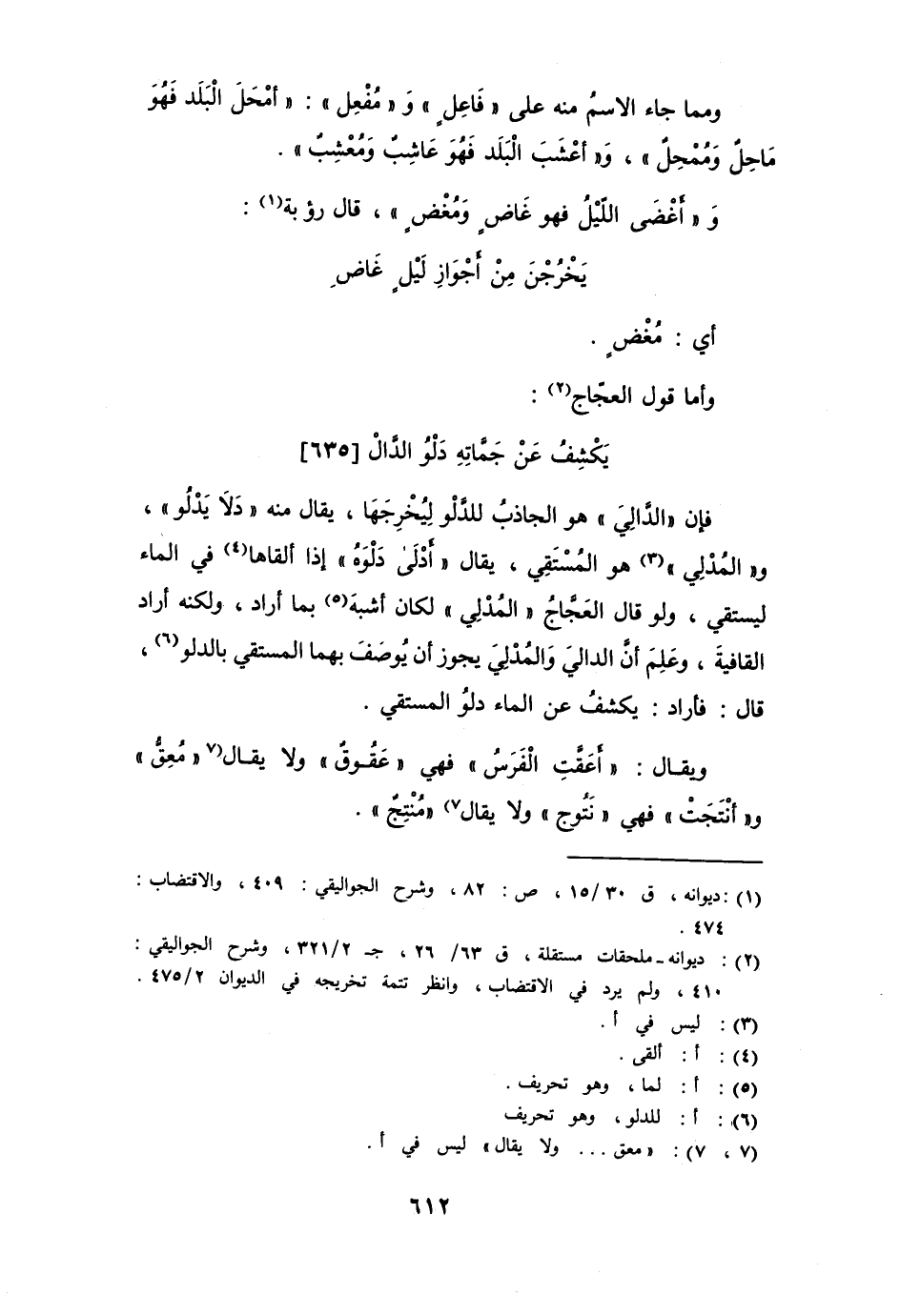 فإن " الدَّالي " هو الجاذبُ للدَّلْو ليخرجها، يقال منه " دَلا يَدْلُو "، و " المُدْلي " هو المُسْتَقي، يقال " أَدْلَى دَلْوَهُ " إذا ألقاها في الماء ليستقي، ولو قال العجاج المُدْلي لكان أشبه بما أراد، ولكنه أراد القافية، وعلم أن الدالي والمُدْلي يجوز أن يوصف بهما المستقي بالدلو، قال: فأراد يكشف عن الماء دلو المستقي.