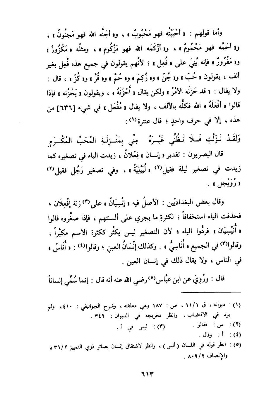 وقال بعض البغداديين: الأصل فيه " إنْسِيَان " على زنة إفْعِلان؛ فحذفت الياء استخفافاً؛ لكثرة ما يجري على ألسنتهم، فإذا صغروه قالوا " أُنَيْسِيَان " فردُّوا الياء؛ لأن التصغير ليس يكثر ككثرة الاسم مكبّراً، وقالوا في الجميع " أَنَاسِيّ ". وكذلك إنْسَان العين؛ وقالوا: " أُنَاسٌ " في الناس، ولا يقال ذلك في إنسان العين.