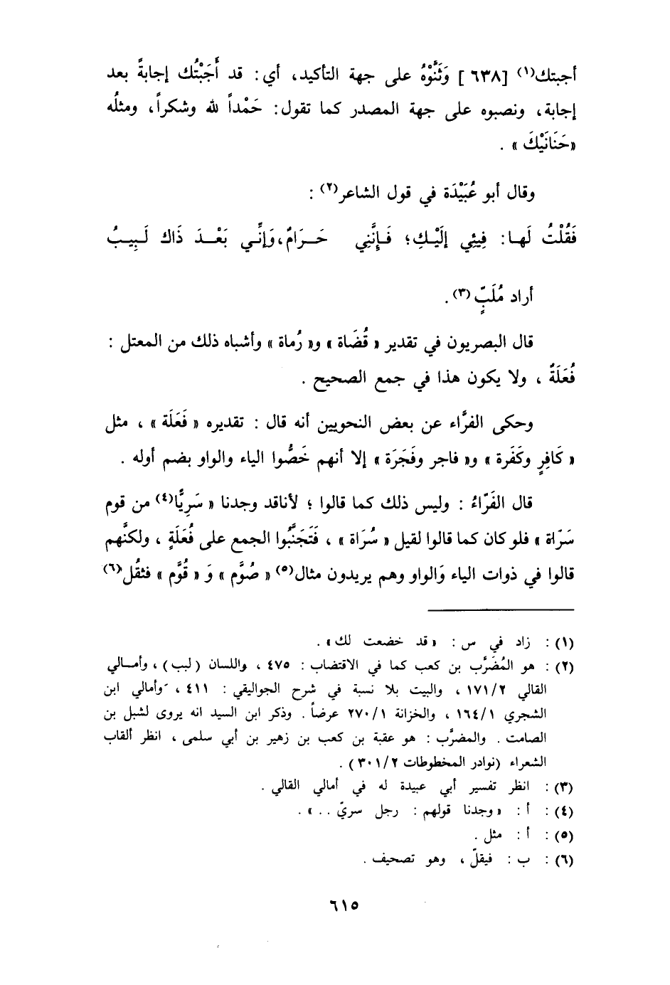 قال البصريون في تقدير " قُضَاة " و " رُمَاة " وأشباه ذلك في المعتل: فُعَلَة، ولا يكون هذا في جمع الصحيح.