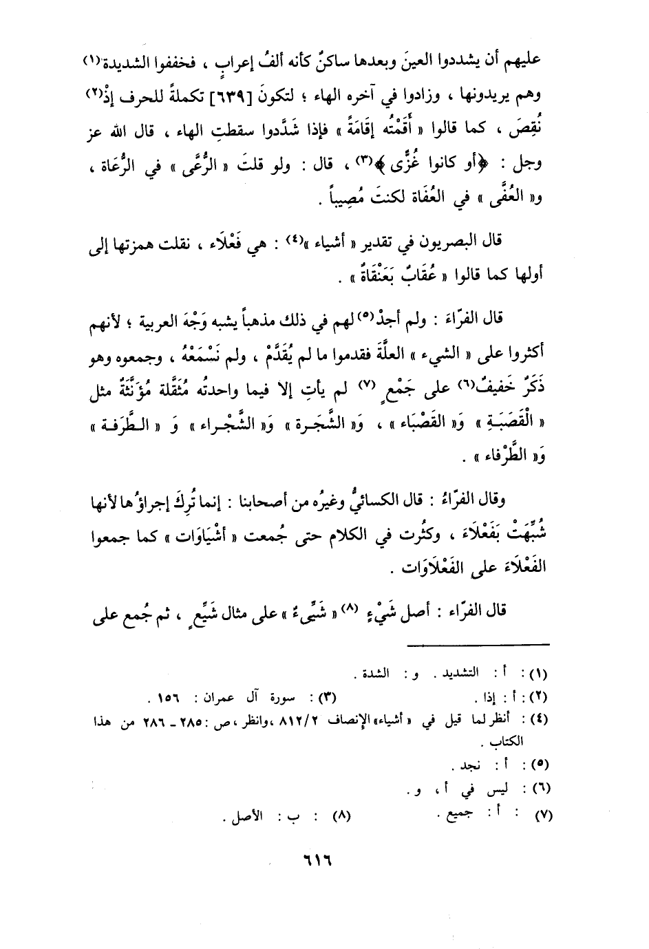 قال الفرّاء: ولم أجد لهم في ذلك مذهباً يشبه وَجْهَ العربية؛ لأنهم أكثروا على " الشيء " العلَّة فقدموا ما لم يقدّم، ولم نسمعه، وجمعوه وهو ذكر خفيف على جمع لم يأت إلا فيما واحدته مُثَقَّلة مؤنثة مثل " القَصَبَة " و " القَصْبَاء "، و " الشَّجَرة " و " الشَّجْراء " و " الطَّرَفة " و " الطَّرْفاء ".