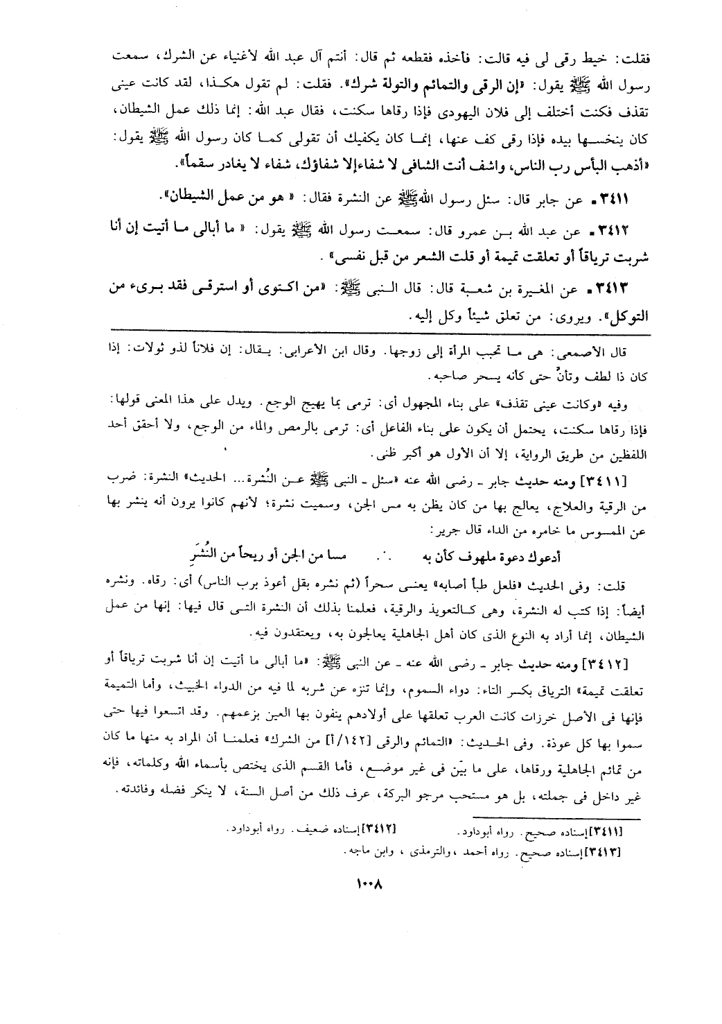 [3412] ومنه حديث جابر -رضي الله عنه- عن النبي - صلى الله عليه وسلم -: (ما بالي ما أتيت إن أنا شربت ترياقاً أو تعلقت تميمة) الترياق بكسر التاء: دواء السموم، وإنما تنزه عن شربه لما فيه من الدواء الخبيث، وأما التميمة فأنها في الأصل خرزات كانت العرب تعلقها على أولادهم ينفون بها العين بزعمهم. وقد اتسعوا فيها حتى سموا بها كل عوزة. وفي الحديث: (التمائم والرقى [142/أ] من الشرك) فعلمنا أن المراد به منها ما كان من تمائم الجاهلية ورقاها، على ما بين في غير موضع، فأما القسم الذي يختص بأسماء الله وكلماته، فإنه غير داخل في جملته، بل هو مستحب مرجو البركة، عرف ذلك من أصل السنة، لا ينكر فضله وفائدته.