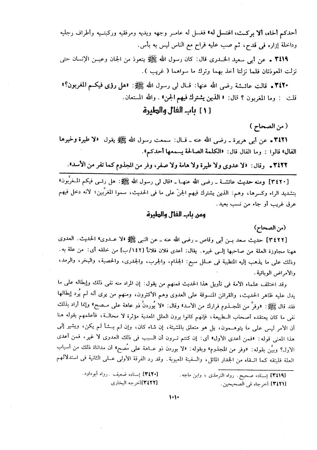 [3422] حديث سعد بن أبي وقاس -رضي الله عنه- عن النبي - صلى الله عليه وسلم - (لا عدوى) الحديث. العدوى ههنا مجاوزة العلة من صاحبها إلى غيره. يقال: أعدى فلان فلاناً [142/ب] من خلقه أي: من علة به. وذلك على ما يذهب إليه المتطيبة في علل سبع: الجذام، والجرب، والجدري، والحصبة، والبخر، والرمد، والأمراض الوبائية.