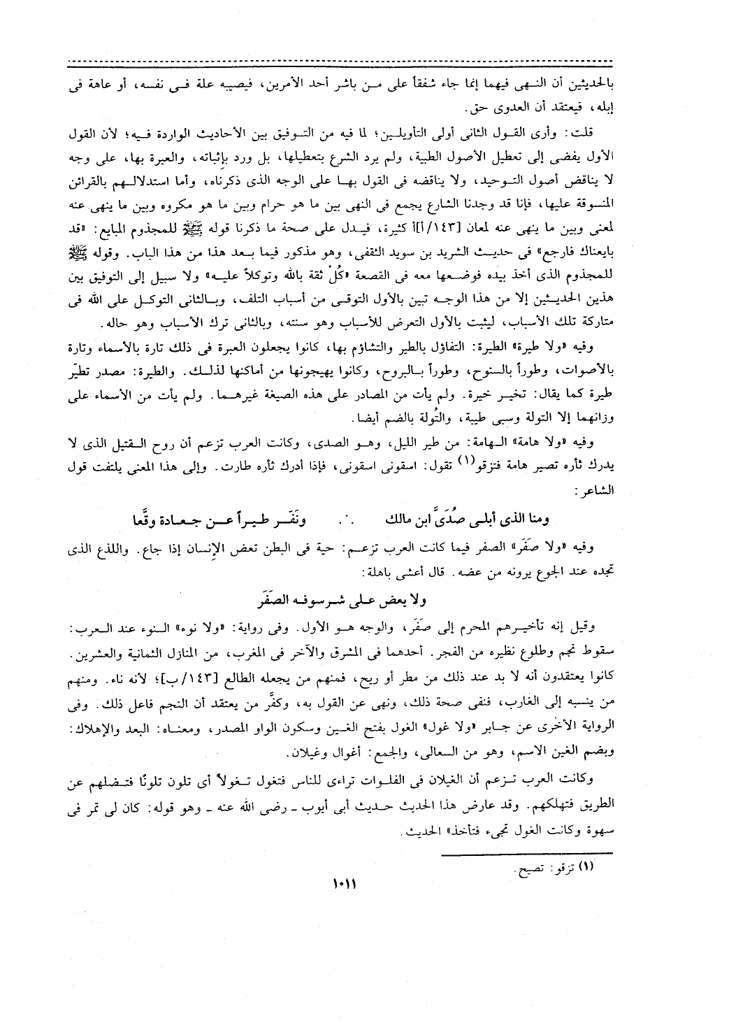 وقيل إنه تأخيرهم المحرم إلى صفر، والوجه هو الأول. وفي رواية: (ولا نوء) النوء عند العرب: سقوط نجم وطلوع نظيره من الفجر. أحدهما في المشرق والآخر في المغرب، من المنازل الثمانية والعشرين.