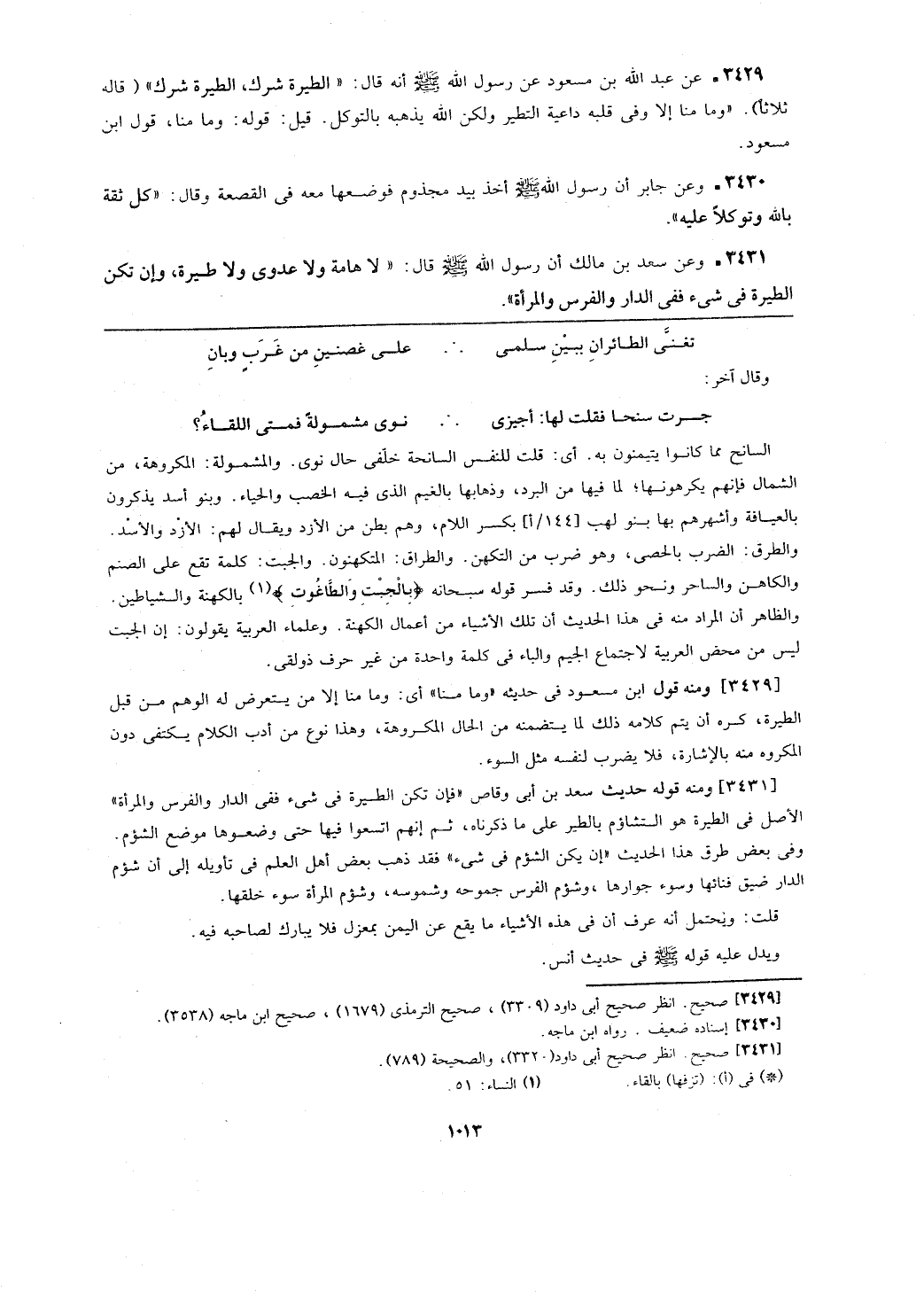 [3431] ومنه قوله حديث سعد بن أبي وقاص (فإن تكن الطيرة في شيء ففي الدار والفرس والمرأة) الأصل في الطيرة هو التشاؤم بالطير على ما ذكرناه، ثم إنهم اتسعوا فيها حتى وضعوها موضع الشؤم. وفي بعض طرق هذا الحديث (إن يكن الشؤم في شيء) فقد ذهب بعض أهل العلم في تأويله إلى أن شؤم الدار الضيق فنائها وسوء جوارها، وشؤم الفرس جموحه وشموسه، وشؤم المرأة سوء خلقها.