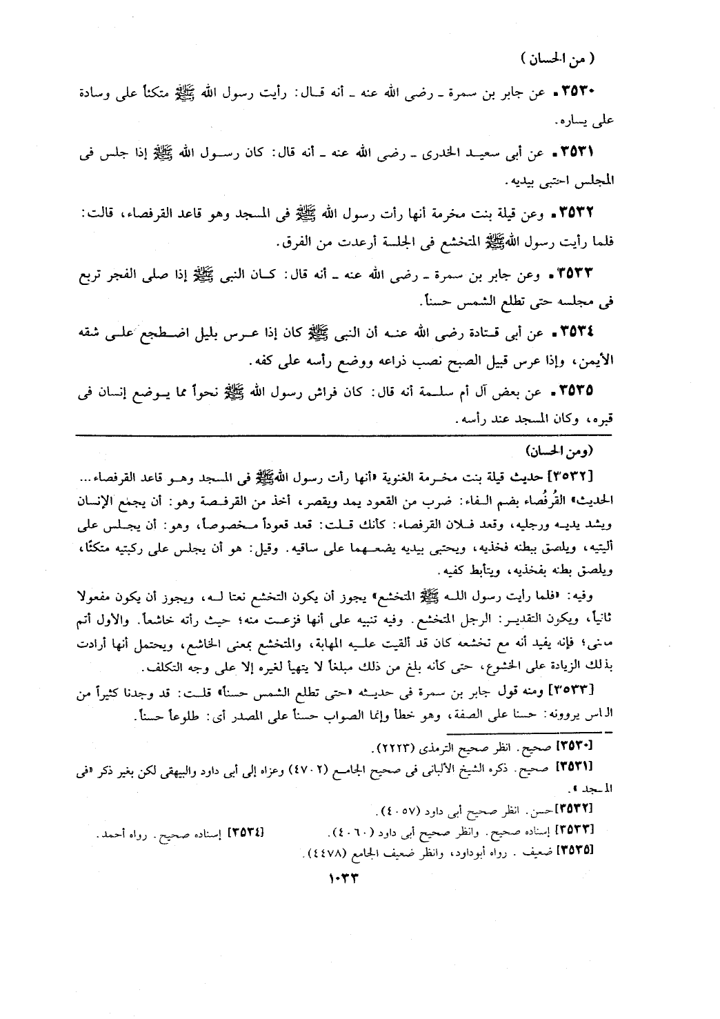 [3532] حديث قيلة بنت مخرمة الغنوية (أنها رأت رسول الله - صلى الله عليه وسلم - في المسجد وهو قاعد القرفصاء ... الحديث) القرفصاء بضم الفاء: ضرب القعود يمد ويقصر، أخذ من القرفصة وهو: أن يجمع الأنسان ويشد يديه ورجليه، وقعد فلان القرفصاء: كأنك قلت: قعد قعودا مخصوصا، وهو: أن يجلس على أليتيه، ويلصق ببطنه فخذيه، ويحتبي بيديه يضعهما على ساقيه. وقيل: هو أن يجلس على ركبتيه متكئا، ويلصق بطنه بفخذيه، ويتأبط كفيه.