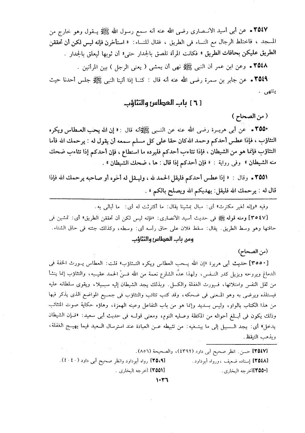 [3550] حديث أبي هريرة (إن الله يحب العطاس ويكره التثاؤب) قلت: العطاس يورث الخفة في الدماغ ويروحه ويزيل كدر النفس، ولهذا عدَّه الشارع نعمة من الله فنّ الحمد عقيبه، والتثاؤب إنما ينشأ من ثقل النفس وامتلائها، فيورث الغفلة والكسل. وبذلك يجد الشيطان إليه سبيلا، ويقوي سلطانه عليه فيستلذه ويرضى به وهو المعنى في ضحكه، وقد كتب تثائب والتثاؤب في جميع المواضع الذي يذكر فيها من هذا الكتاب بالواو، وليس بسديد وإنما هو باب التفاعل وعينه الهمزة، وهاؤه حكاية صوت المتثائب وذلك يكون في أبلغ أحواله من المكظة وعليه النوم، ومعنى قوله في حديث أبي سعيد: (فإن الشيطان يدخل) أي: يجد السبيل إلى ما يبتغيه: من تثبيطه عن العبادة عند استرسال العبد فيما يهيج الغفلة، ويذهب التيقظ.