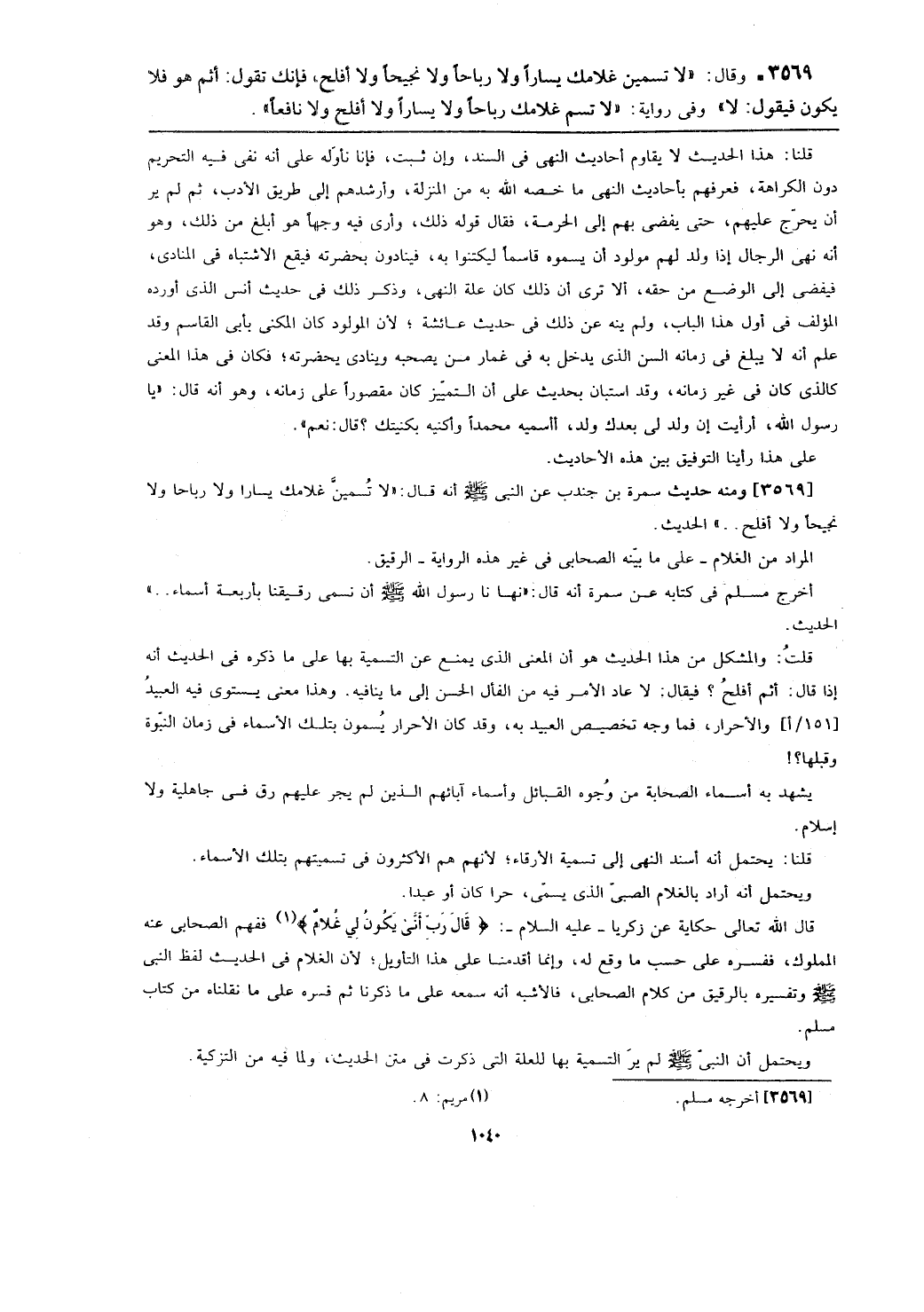 [3569] ومنه حديث سمرة بن جندب عن النبي - صلى الله عليه وسلم - أنه قال: (لاتُسمينَّ غلامك يساراً ولا رباحاً ولا نجيحاً ولا أفلح ...) الحديث.