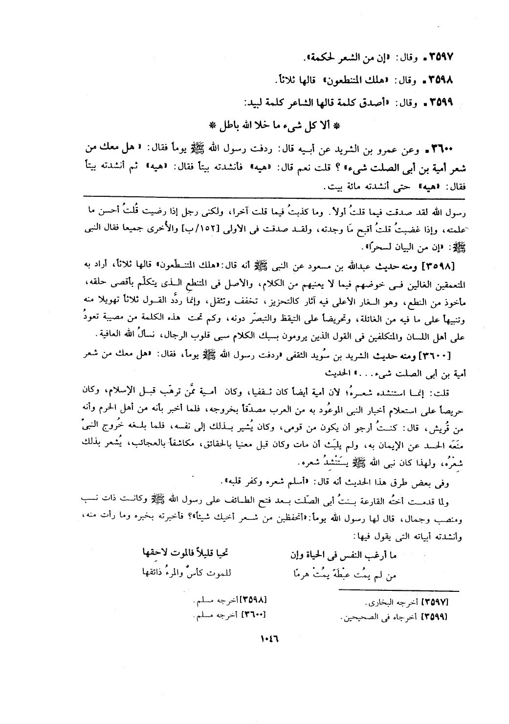 قلت: إنما استنشده شعره؛ لأن أمية أيضاً كان ثقفيا، وكان أمية ممن ترهب قبل الإسلام، وكان حريصاً على استعلام أخبار النبي الموعود به من العرب مصدقاً بخروجه، فلما أخبر بأنه من أهل الحرم وأنه من قريش، قال: كنت أرجو أن يكون من قومي، وكان يشير بذلك إلى نفسه، فلما بلغه خروج النبي منعه الحسد عن الإيمان به، ولم يلبث أن مات وكان قبل معنياً بالحقائق، مكاشفاً بالعجائب، يشعر بذلك شعره، ولهذا كان نبي الله - صلى الله عليه وسلم - يستنشد شعره.