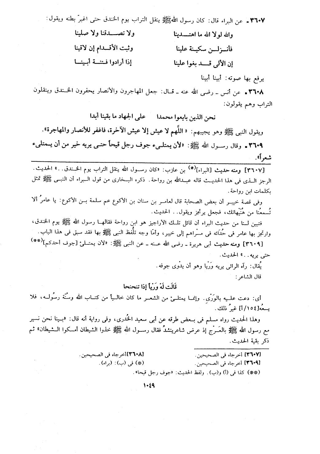 فتبين لنا من حديث البراء أن قائل تلك الأراجيز هو ابن رواحة فقالها رسول الله - صلى الله عليه وسلم - يوم الخندق، وارتجز بها عامر في حُدائه في مسراهم إلى خيبر، وأما وجه تلُّفظ النبي - صلى الله عليه وسلم - بها فقد سبق في هذا الباب.