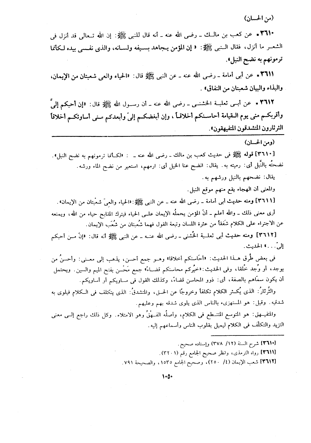 [3611] ومنه حديث أبي أمامة -رضي الله عنه- عن النبي - صلى الله عليه وسلم -: (الحياء والعي شعبتان من الإيمان). أرى معنى ذلك -والله أعلم- أن المؤمن يحمله الإيمان على الحياء فيترك المقابح حياء من الله، ويمنعه عن الاجتراء على الكلام شفقاً من عثرة اللسان وتبعة القول فهما شُعبتان من شعب الإيمان.