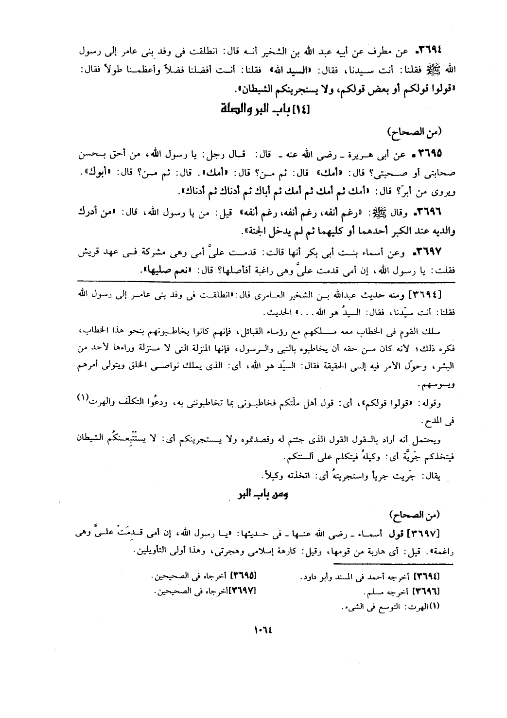 [3694] ومنه حديث عبد الله بن الشخير العامري قال: (انطلقت في وفد بني عامر الى رسول الله فقلنا: انت سيدنا، فقال: السيد هو الله ...) الحديث.