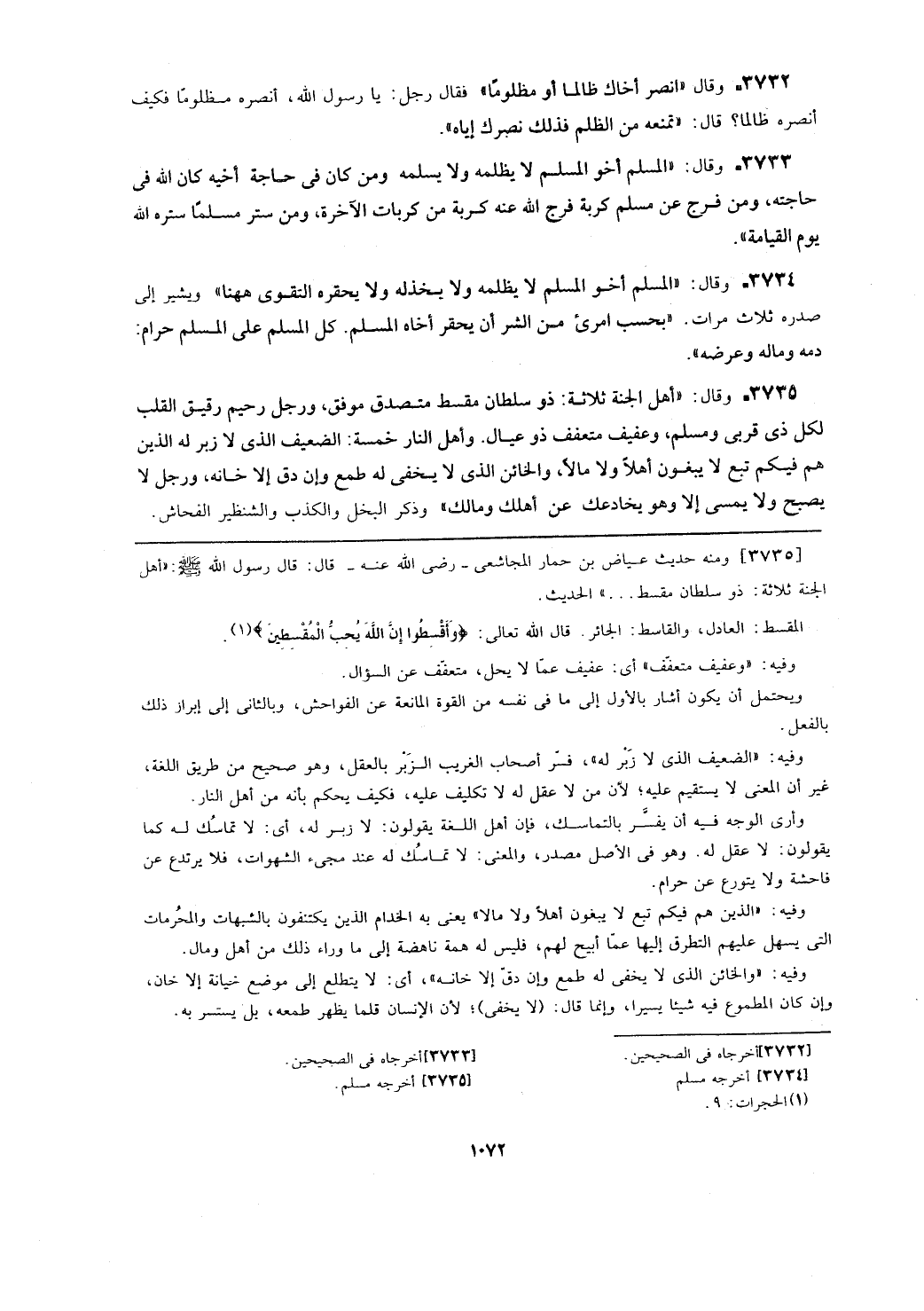 [3735] ومنه حديث عياض بن حمار المجاشعي- رضي الله عنه- قال: قال رسول الله - صلى الله عليه وسلم -: (أهل الجنة ثلاثة: ذو سلطان مقسط ...) الحديث.