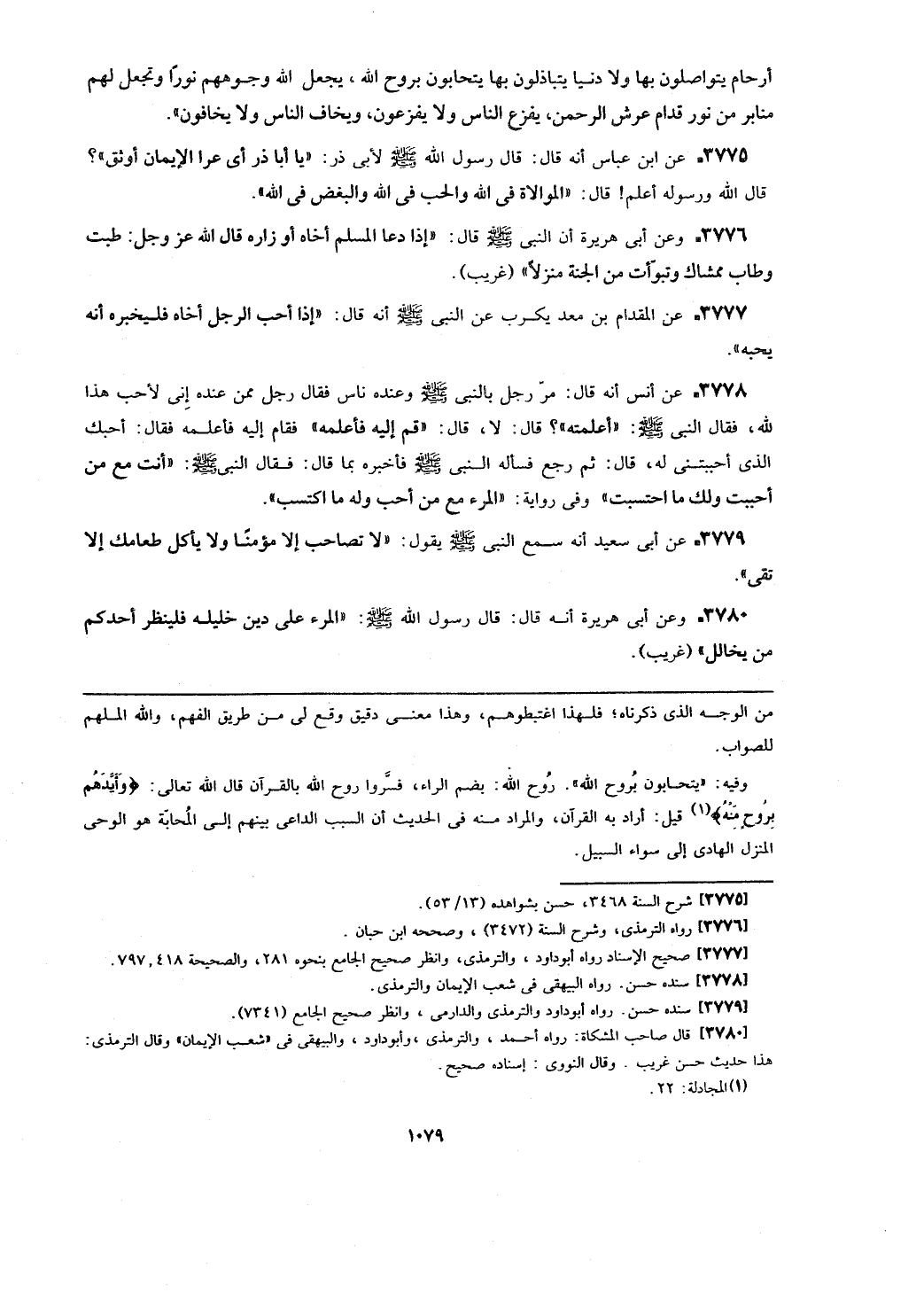 وفيه: (يتحابون بروح الله). روح الله: بضم الراء، فسروا روح الله بالقرآن قال الله تعالى: {وأيدهم بروح منه} قيل: أراد به القرآن، والمراد منه في الحديث أن السبب الداعي بينهم إلى المحابة هو الوحي المنزل الهادي إلى سواء السبيل.