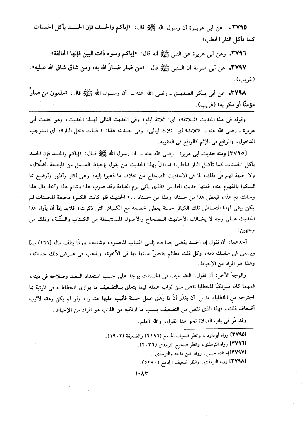 [3795] ومنه حديث أبي هريرة- رضي الله عنه- أن رسول الله - صلى الله عليه وسلم - قال: (إياكم والحسد فإن الحسد يأكل الحسنات كما تأكل النار الحطب) استدل بهذا الحديث من يقول بإحباط العمل من المبتدعة الضلال، ولا حجة لهم في ذلك، لما في الأحاديث الصحاح من خلاف ما ذهبوا إليه، وهي أكثر وأظهر وأوضح مما تمسكوا بالمفهوم عنه، فمنها حديث المفلس (الذي يأتي يوم القيامة وقد ضرب هذا وشتم هذا وأخذ مال هذا وسفك دم هذا، فيعطي هذا من حسناته وهذا من حسناته ..) الحديث. فلو كانت الكبيرة محبطة للحسنات لم يكن يبقى لهذا المتعاطي تلك الكبائر حسنة يعطي خصمه مع الكبائر التي ذكرت؛ فلابد إذاً أن يأول هذا الحديث على وجه لا يخالف الأحاديث الصحاح والأصول المستنبطة من الكتاب والسنة، وذلك من وجهين: