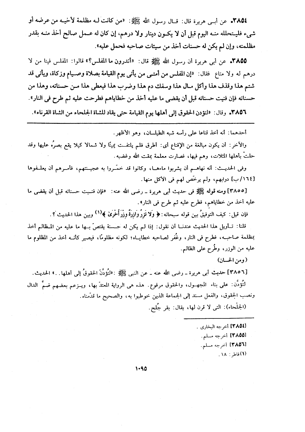 [3855] ومنه قوله - صلى الله عليه وسلم - في حديث أبي هريرة- رضي الله عنه-: (فإن فنيت حسناته قبل أن يقضي ما عليه أخذ من خطاياهم، فطرح عليه ثم طرح في النار).