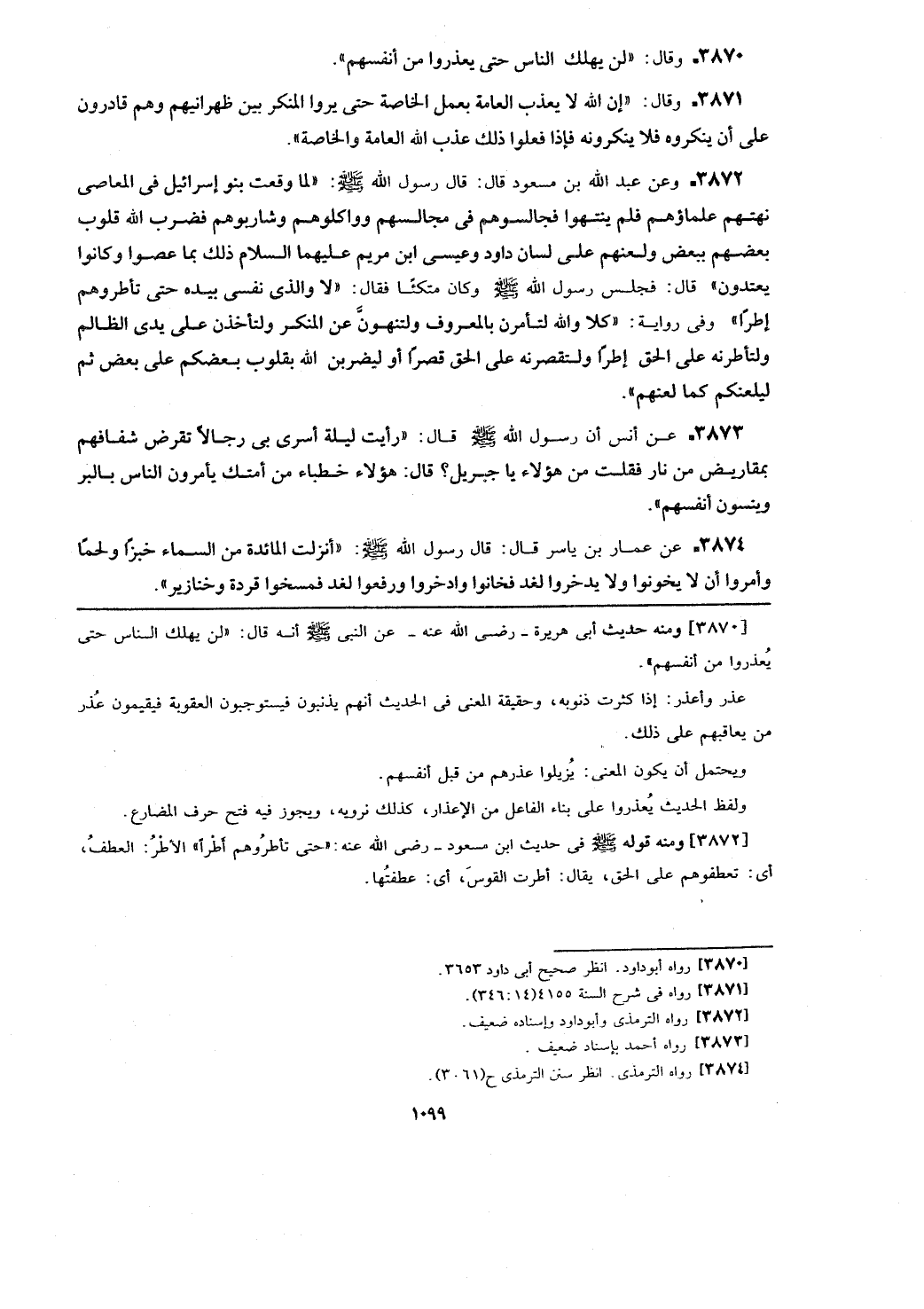 [3870] ومنه حديث أبي هريرة- رضي الله عنه- عن النبي - صلى الله عليه وسلم - أنه قال: (لن يهلك الناس حتى يعذروا من أنفسهم).