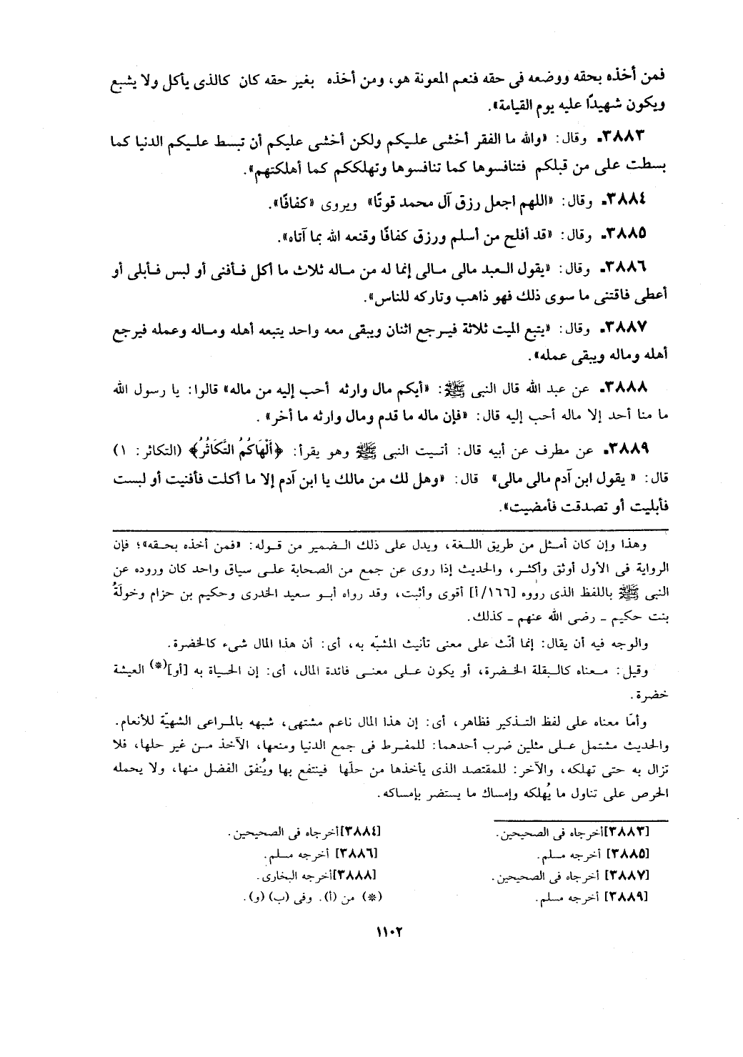 وأما معناه على لفظ التذكير فظاهر، أي: إن هذا المال ناعم مشتهى، شبهه بالمراعي الشهية للأنعام. والحديث مشتمل على مثلين ضرب أحدهما: للمفرط في جمع الدنيا ومنعها، الآخذ من غير حلها، فلا تزال به حتى تهلكه، والآخر: للمقتصد الذي يأخذها من حلها فينتفع بها وينفق الفضل منها، ولا يحمله الحرص على تناول ما يهلكه وإمساك ما يستضر بإمساكه.