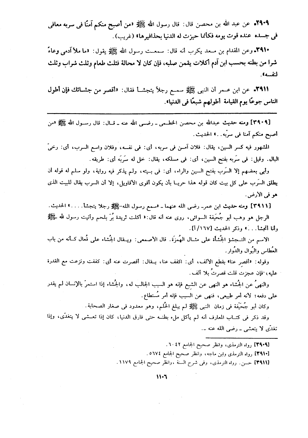 [3909] ومنه حديث عبد الله بن محصن الخطمى- رضي الله عنه- قال: قال رسول الله - صلى الله عليه وسلم - (من أصبح منكم آمنا في سربه ...) الحديث.
