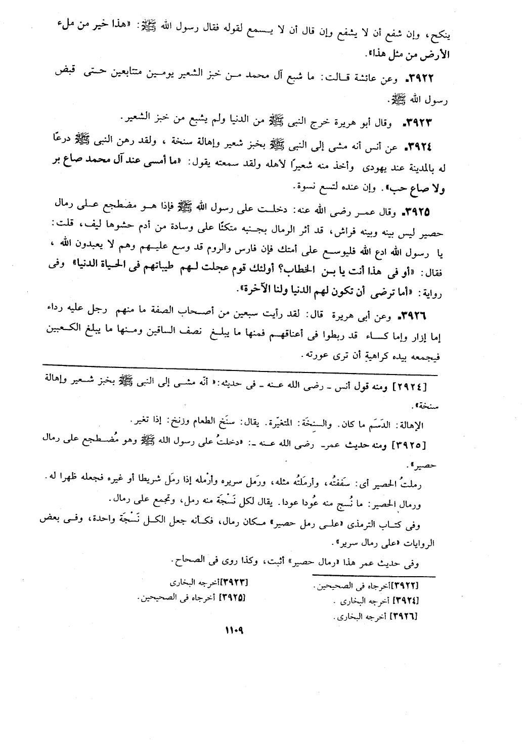 [3925] ومنه حديث عمر- رضي الله عنه-: (دخلت على رسول الله - صلى الله عليه وسلم - وهو مضطجع على رمال حصير).