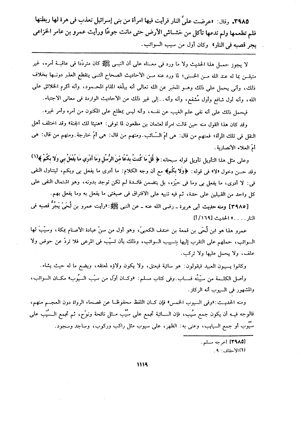 [3985] ومنه حديث أبي هريرة- رضي الله عنه- عن النبي - صلى الله عليه وسلم -: (رأيت عمرو بن لحى يجر قصيه في النار ...) الحديث [169/أ]