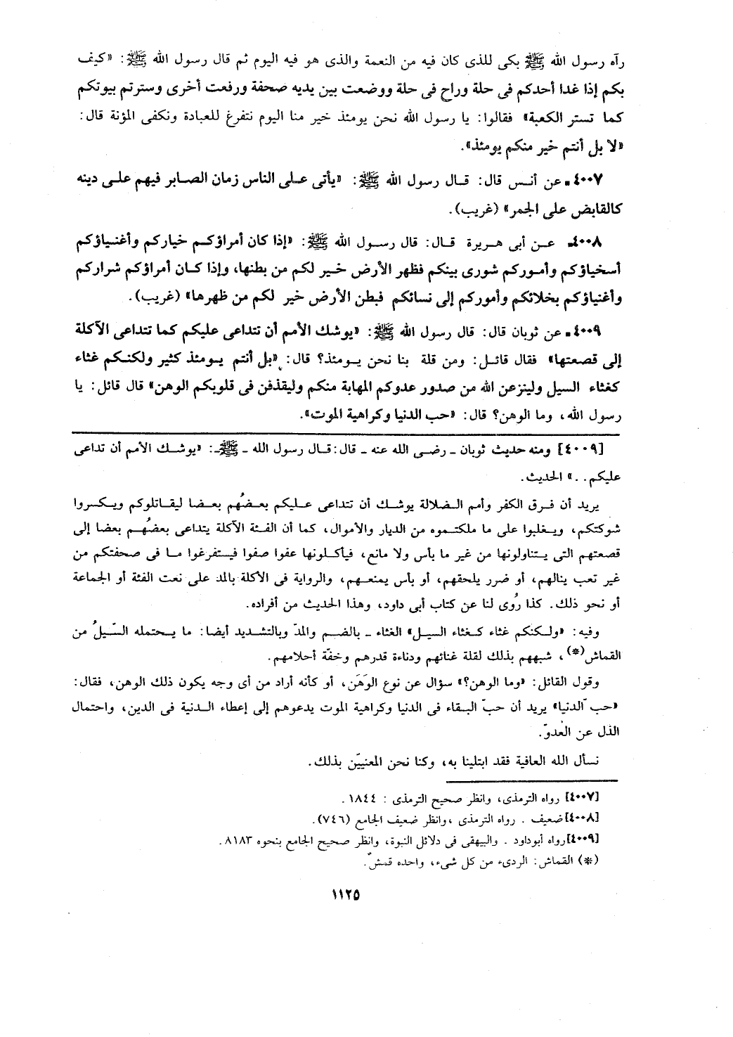 [4009] ومنه حديث ثوبان- رضي الله عنه- قال: قال رسول الله - صلى الله عليه وسلم -: (يوشك الأمم أن تداعى عليكم ...) الحديث.