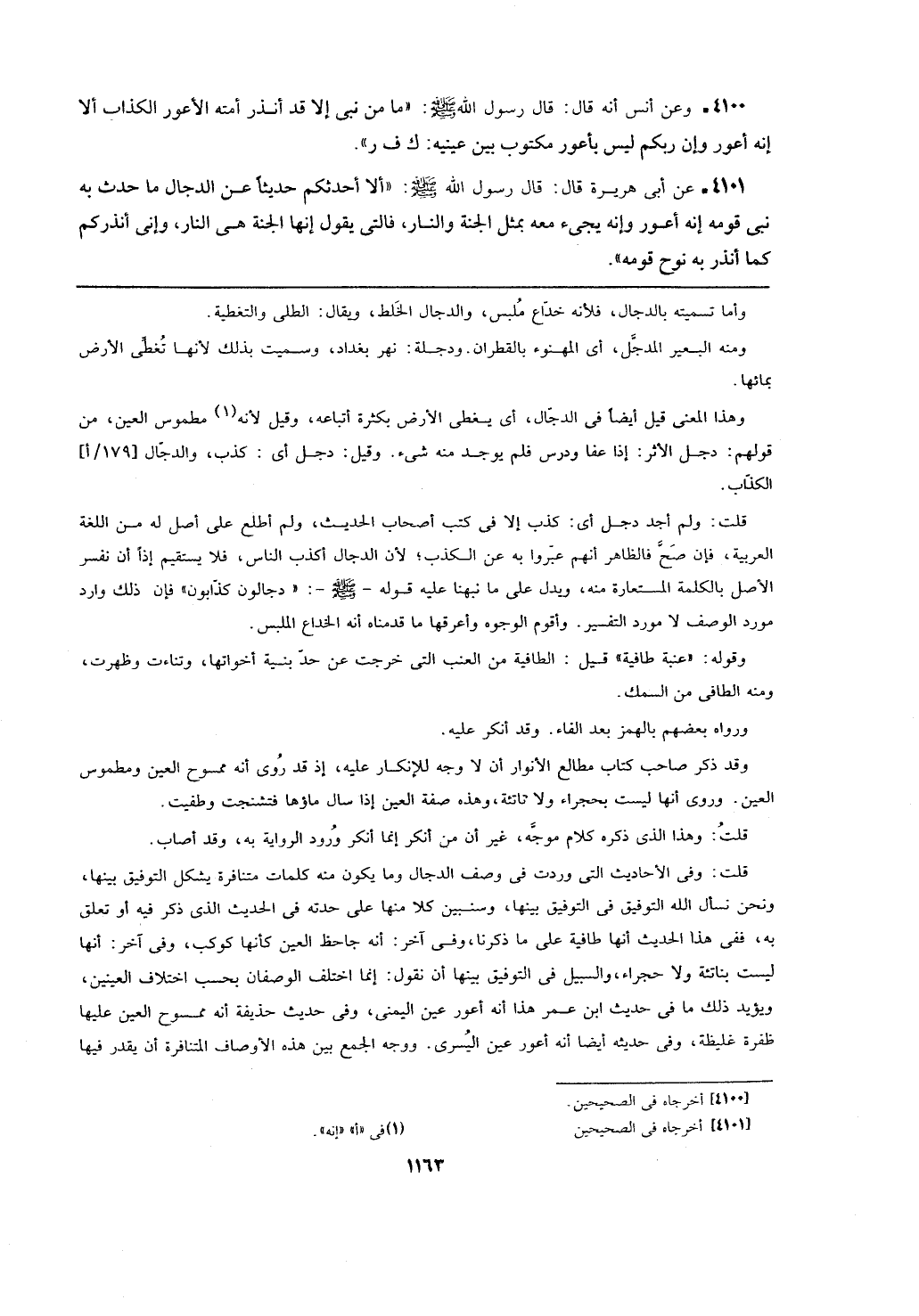 وقد ذكر صاحب كتاب مطالع الأنوار أن لا وجه للإنكار عليه، إذ قد روي أنه ممسموح العين ومطموس العين، وروي أنها ليست بحجراء، ولا ناتئة، وهذه صفة العين إذا سال ماؤها فتشنجت وطفيت.